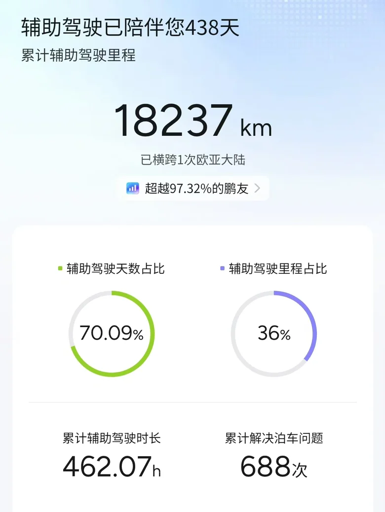 最让我依赖的是辅助驾驶——算下来438天里有七成时间都用它,高速上开累了,拨两下杆或一下杆就能暂时“交个班”,18237公里的智驾xngp/辅助里程够从家到欧洲打个来回,连泊车都帮我解决了688次,以前侧方停车能折腾十分钟,现在它自己怼进去比我稳多了。