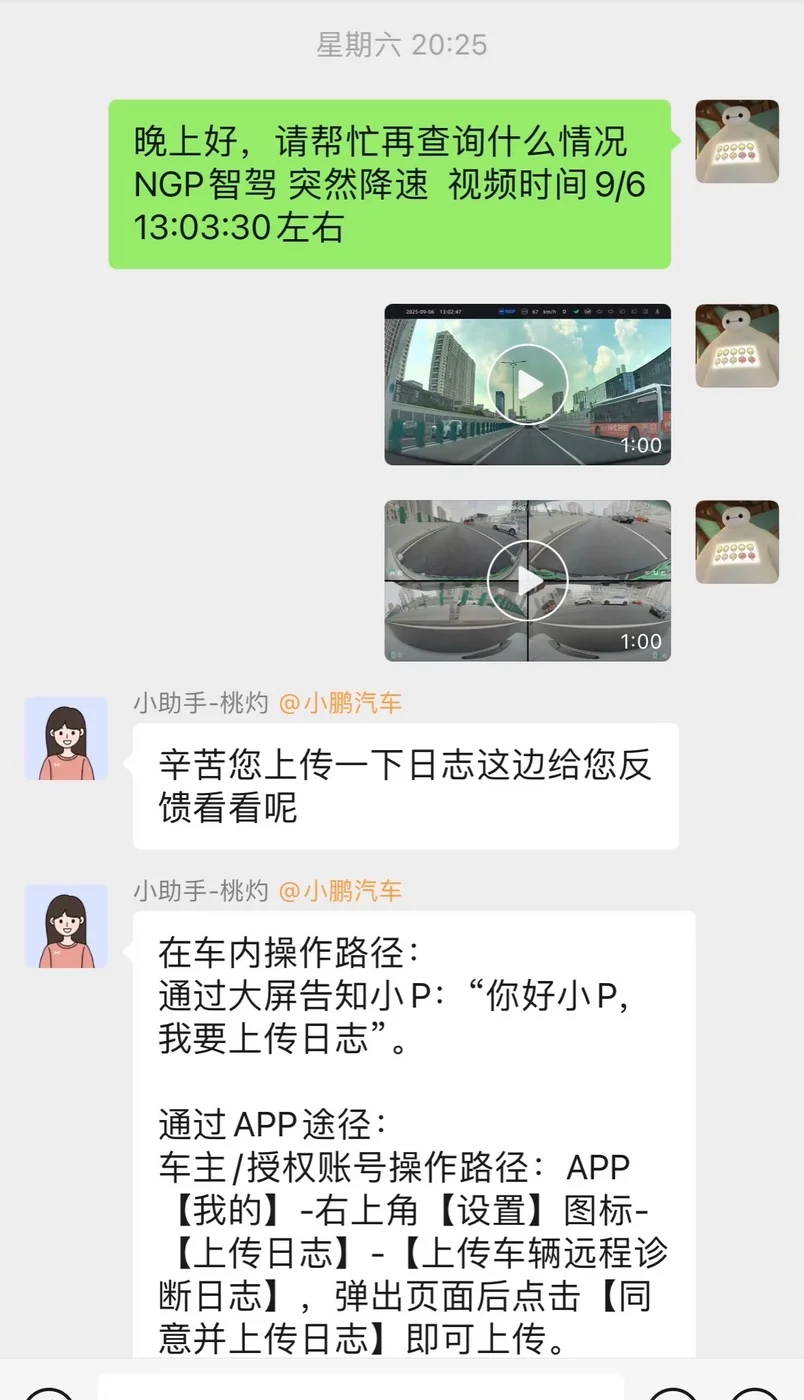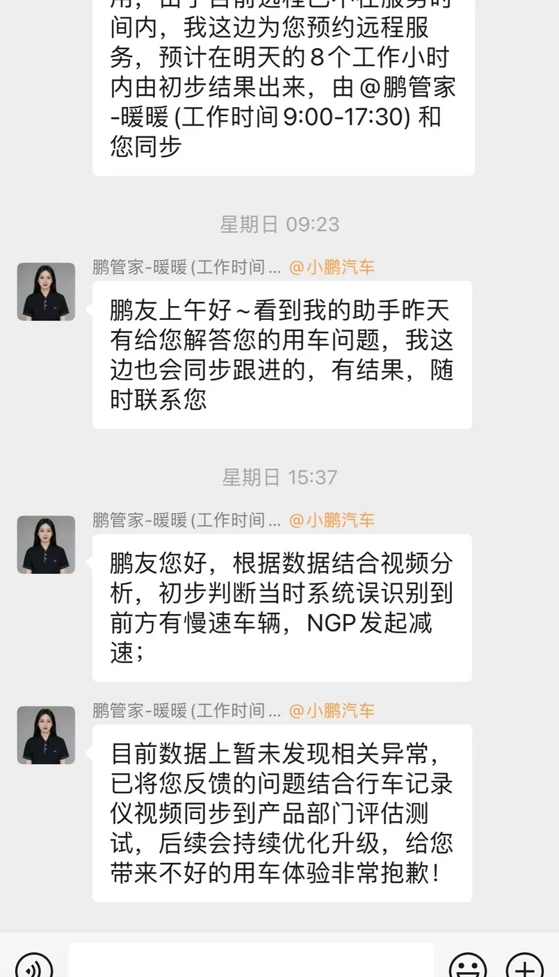 通过400客服或者是群管家反馈并上传日志,工程师能远程分析日志,甚至结合行车记录视频进行诊断。最近因为有遭遇 NGP 在路况良好时异常降速情况。微信群联系了小鹏管家,官方虽能通过远程诊断定位部分原因(如高精地图末覆盖),但更深层的算法优化和系统稳定性仍需加强。车主需随时准备接管,这也提醒我们,现阶段智驾仍是辅助。希望小鹏能持续优化,让技术真正服务于安全与安心。