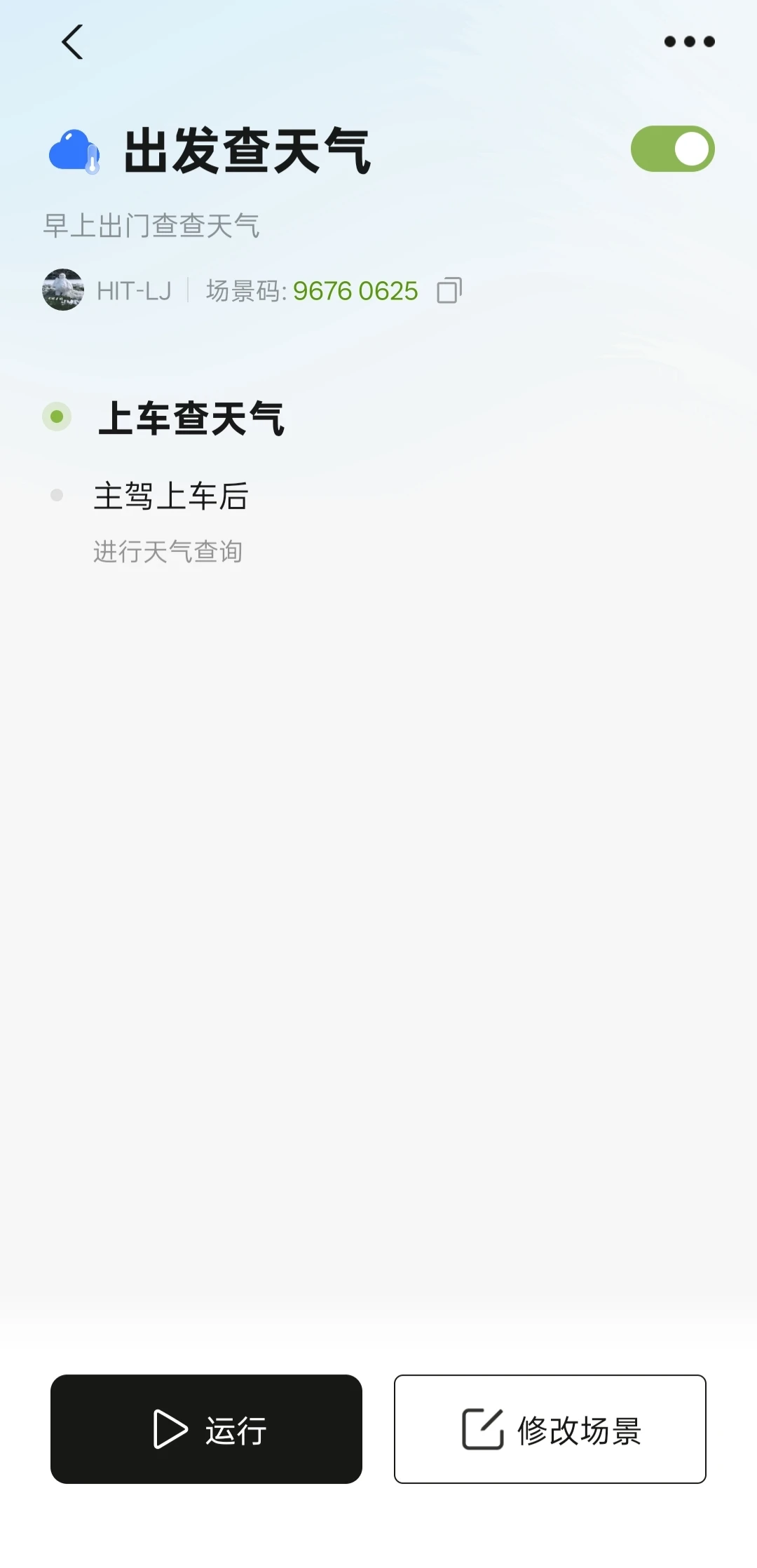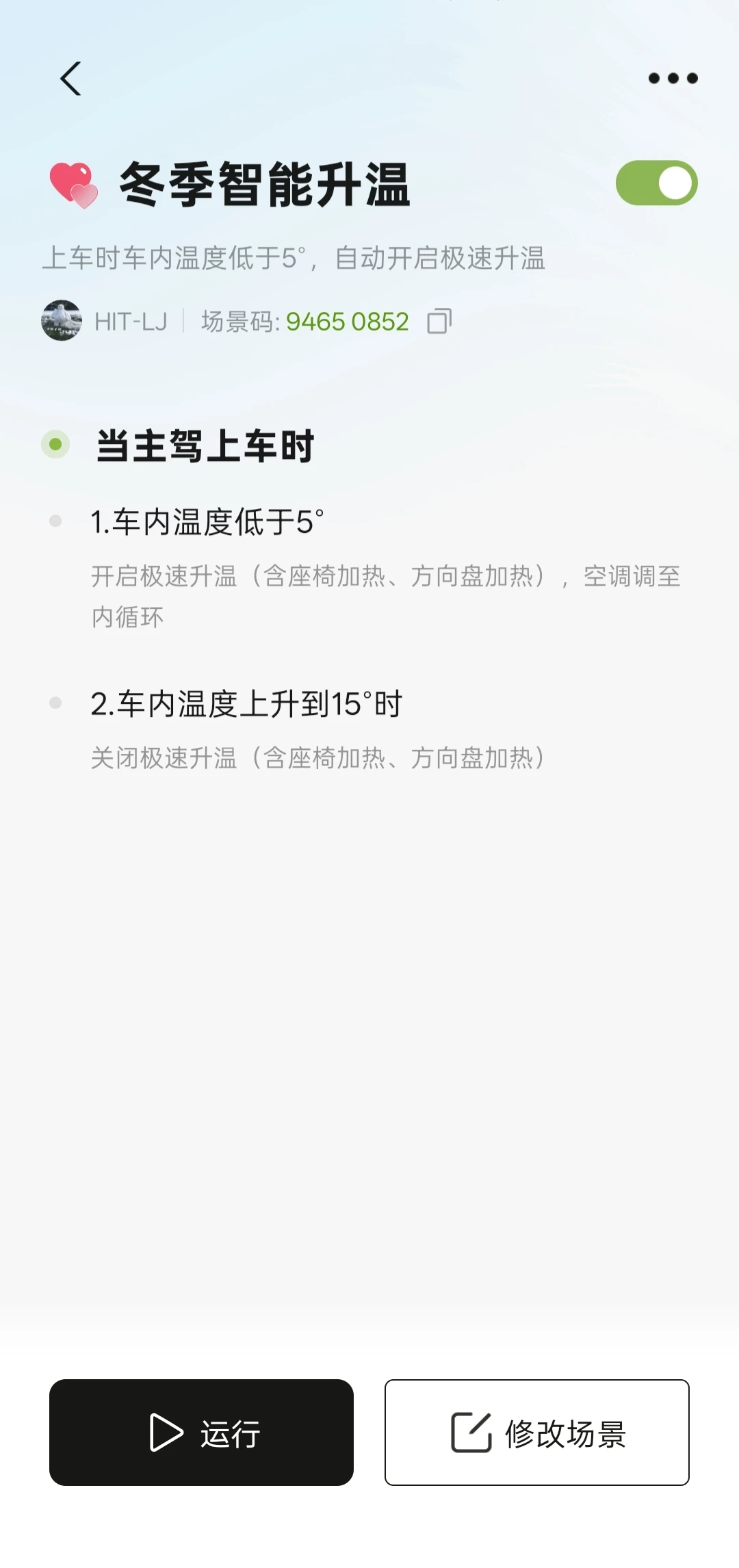 这个功能非常的实用,秋末初冬的时候,气温忽高忽低,每天牛马下班的时候,不知道外面气温如何!有了这个场景功能,如果外面温度低于5度,就能自动打开空调等,让你下班一进车里面,就能有一个温暖舒适的环境。