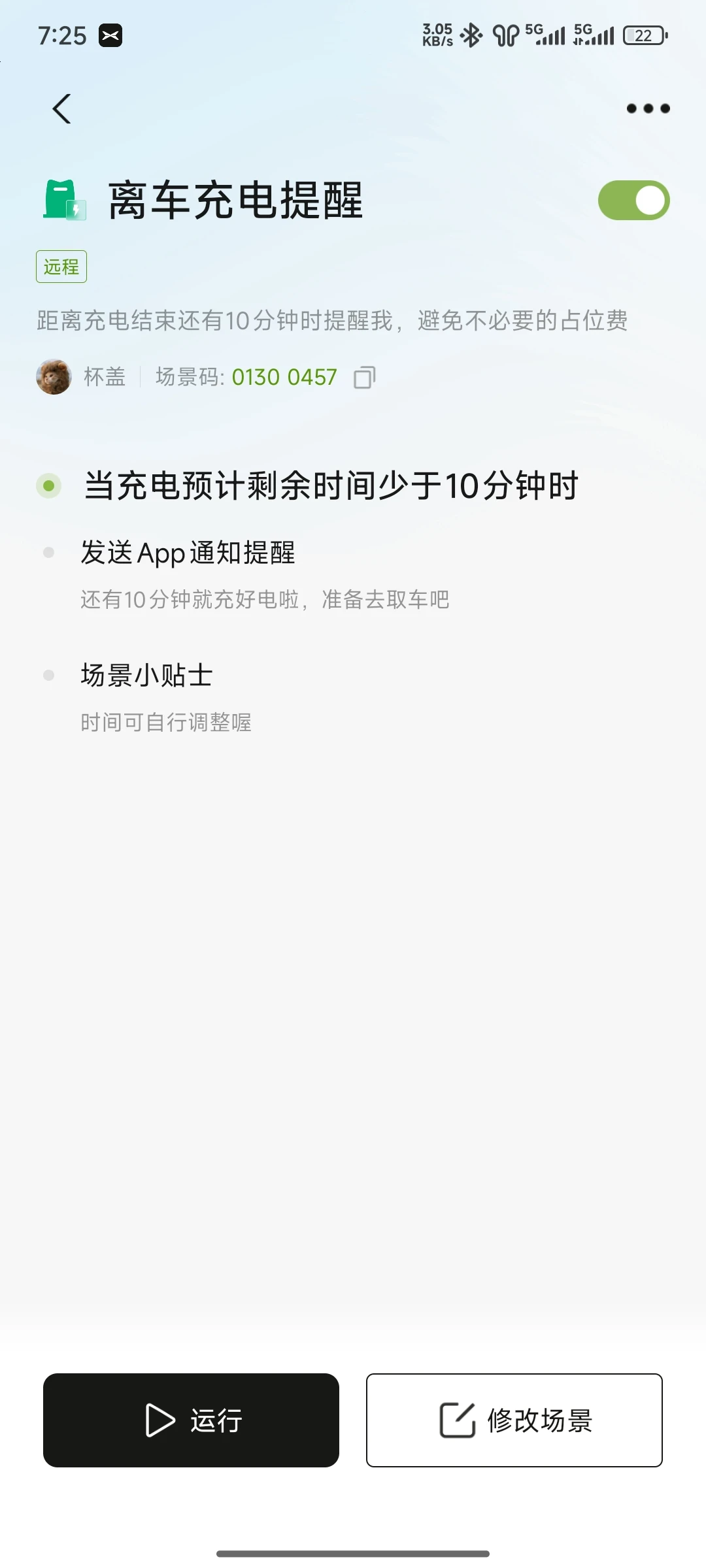 2. 离车充电提醒:当车辆充电预计剩余时间少于10分钟时,手机App会收到提醒消息,能及时去取车,避免产生不必要的占位费,提醒时间还可以自行调整。