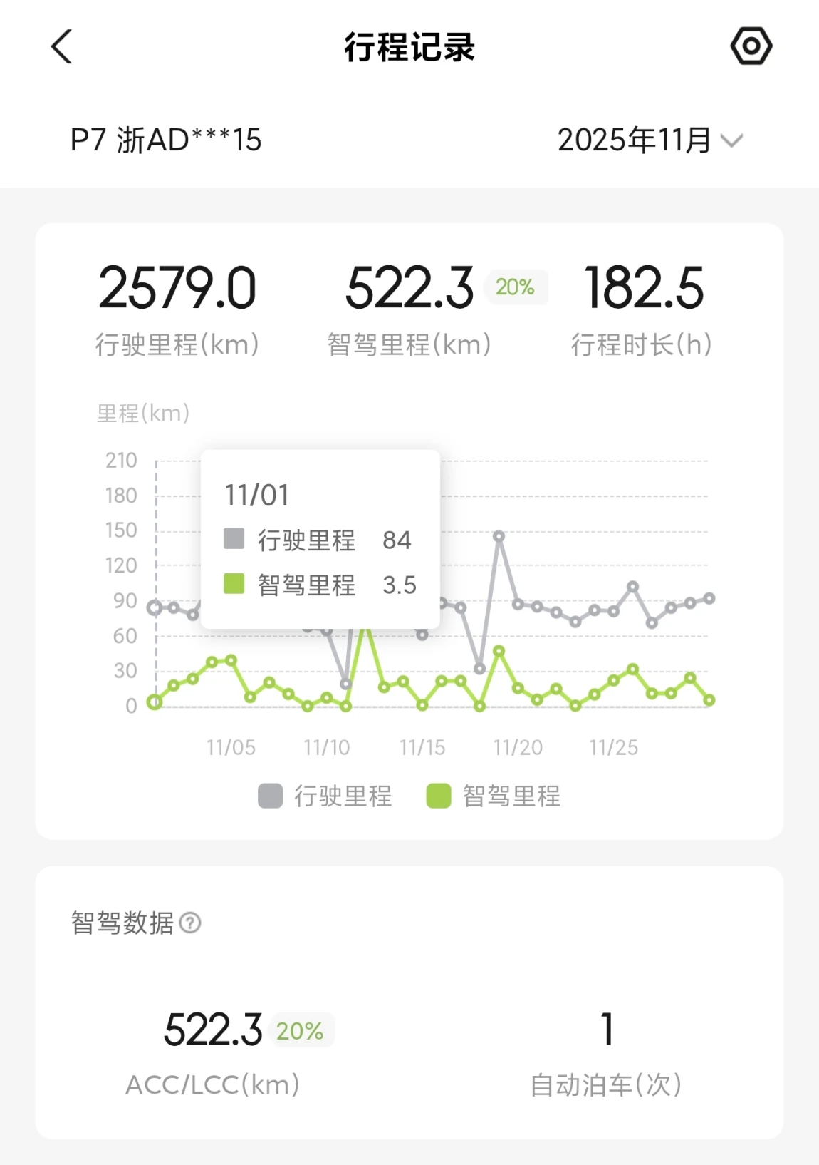 #11月用车总结# 2025年11月,小鹏P7(浙AD****15)累计行驶2579km,智驾里程522.3km(占总里程20%),行程时长182.5小时。智驾以ACC/LCC为主,自动泊车仅1次。从数据曲线看,单日行驶里程波动较大,智驾里程占比稳定,说明本月日常通勤等场景中,智驾功能使用频率较高,辅助驾驶体验得到了充分利用。@鹏友俱乐部