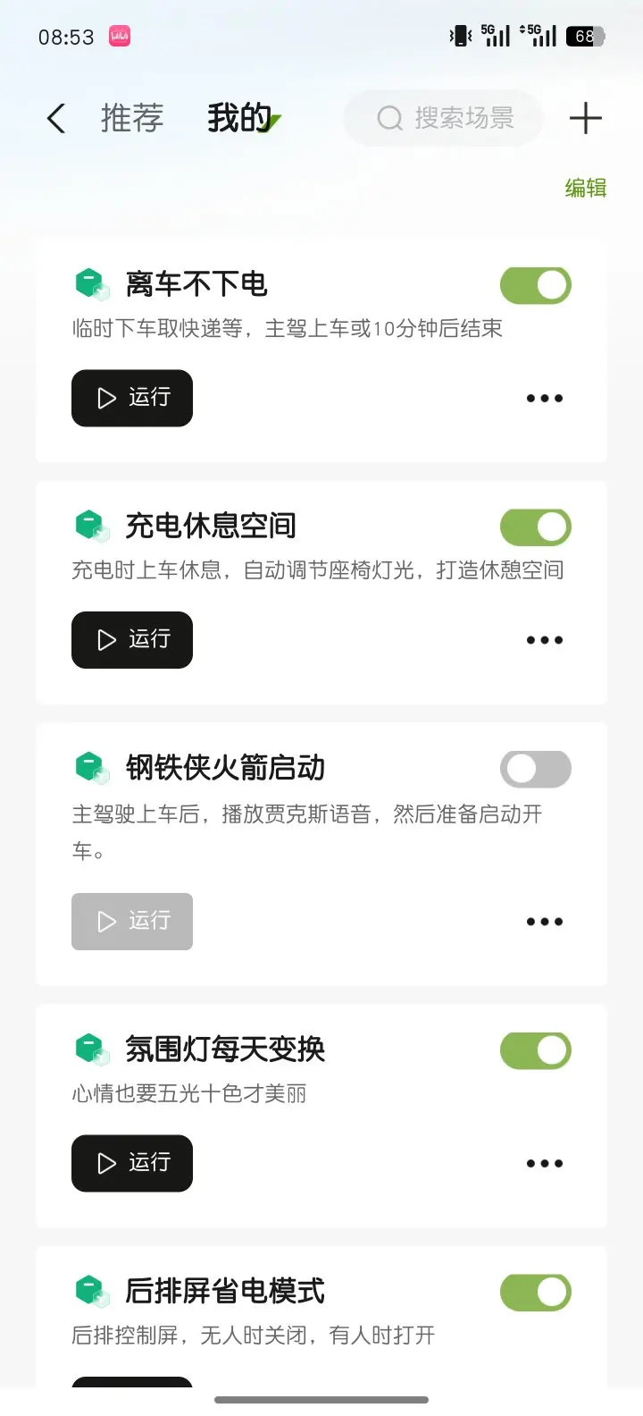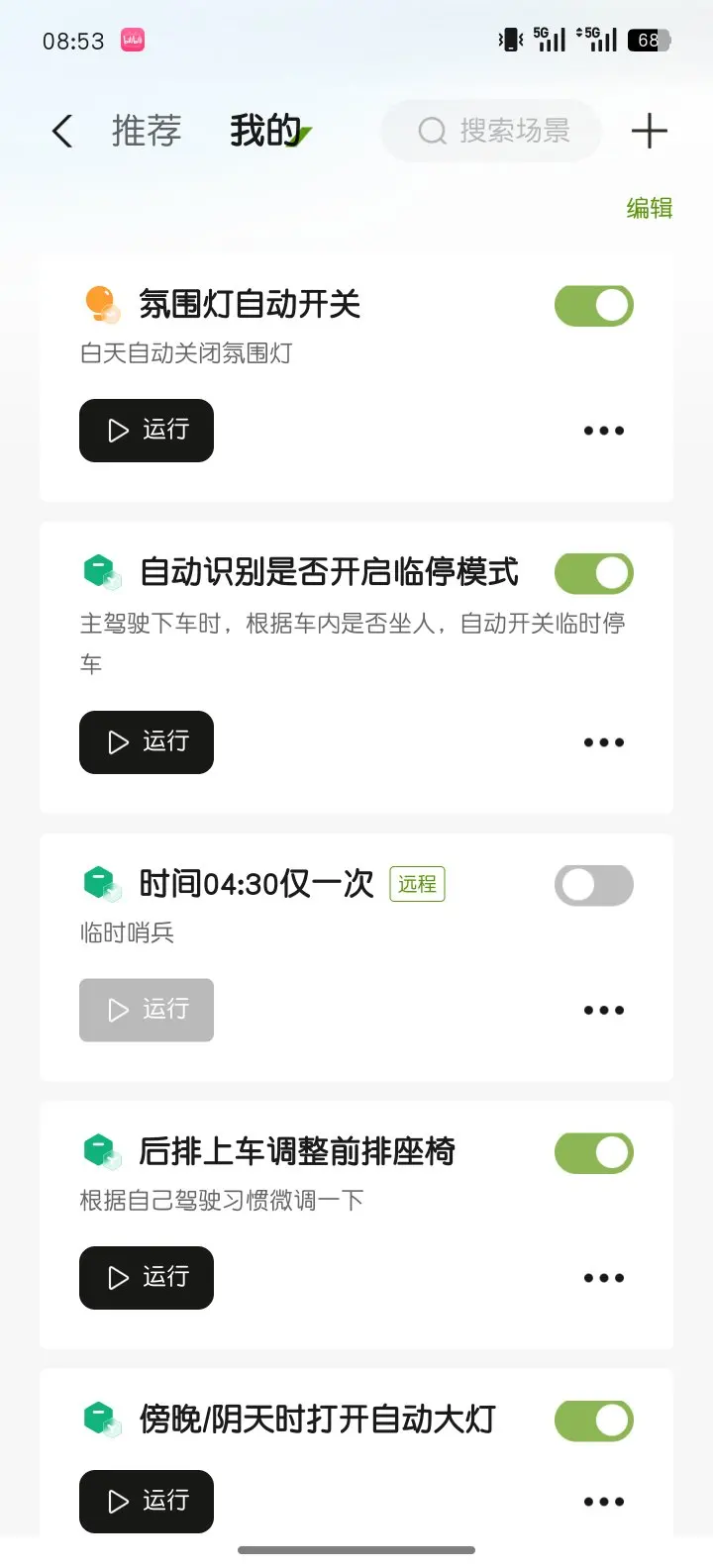 通过我的智慧场景码,日常开车时,大白天氛围灯自动歇着不费电,赶上傍晚灰蒙蒙或者阴天,不用你动手,挂D挡起步时自动大灯就亮了,停好车挂P挡又悄悄关掉;要是后排有人上车,前排座椅还会自动微调腾出空间,连后排的控制屏都比较省事儿,没人碰就自己关了省电,一坐人立刻亮起来。