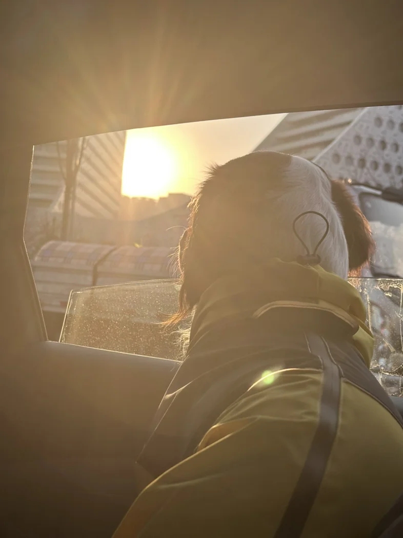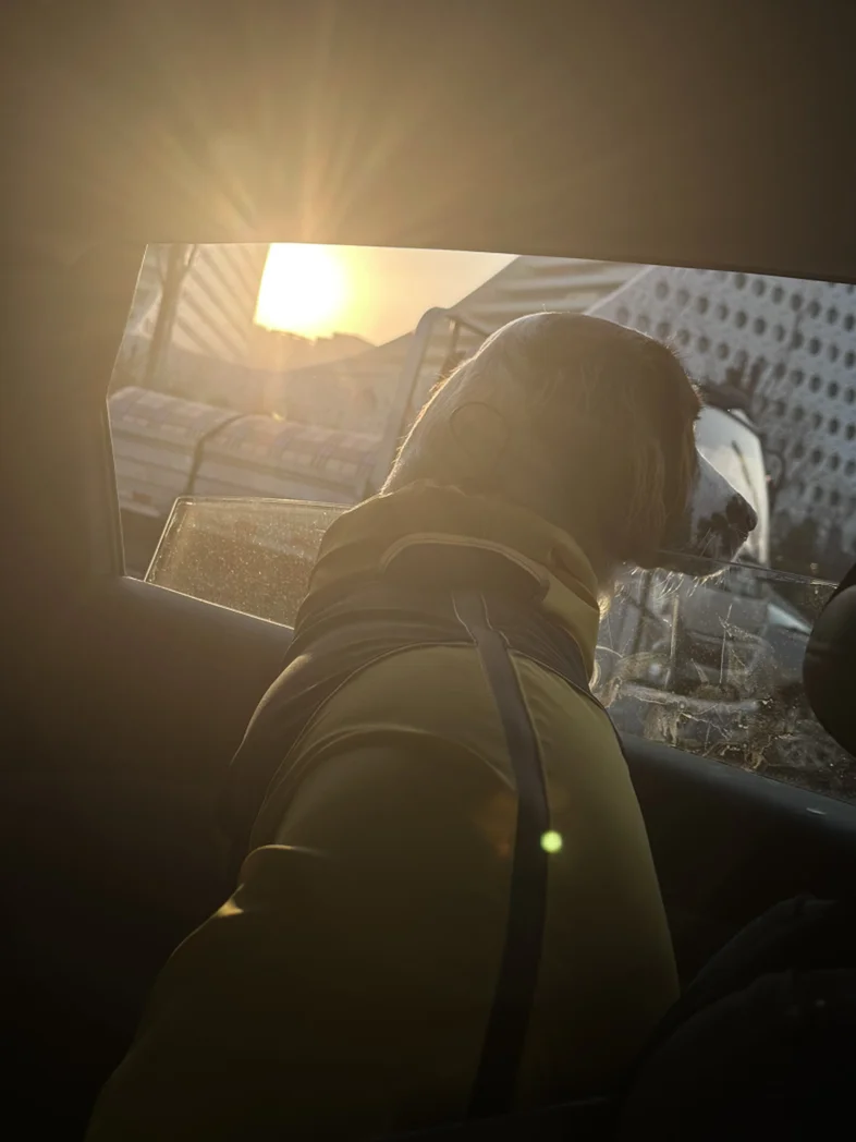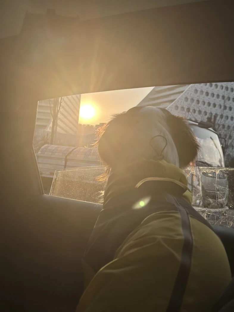 我透过车内后视镜看着这一切,没有打扰。我们共享着同一片暮色,他在后座,我在前座,而夕阳,慷慨地包裹着整台车,和车里这份沉甸甸的、移动的爱。这大概就是“陪伴”最美好的形态——在一起,看世界慢慢温柔地老去。