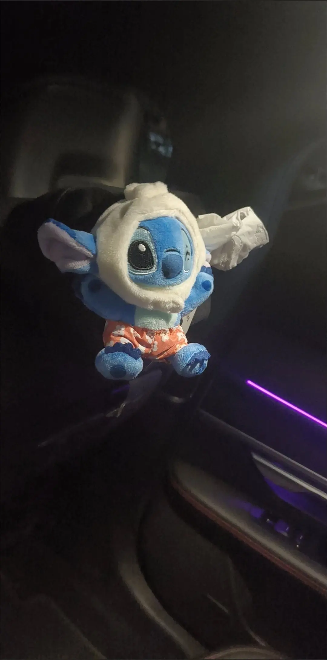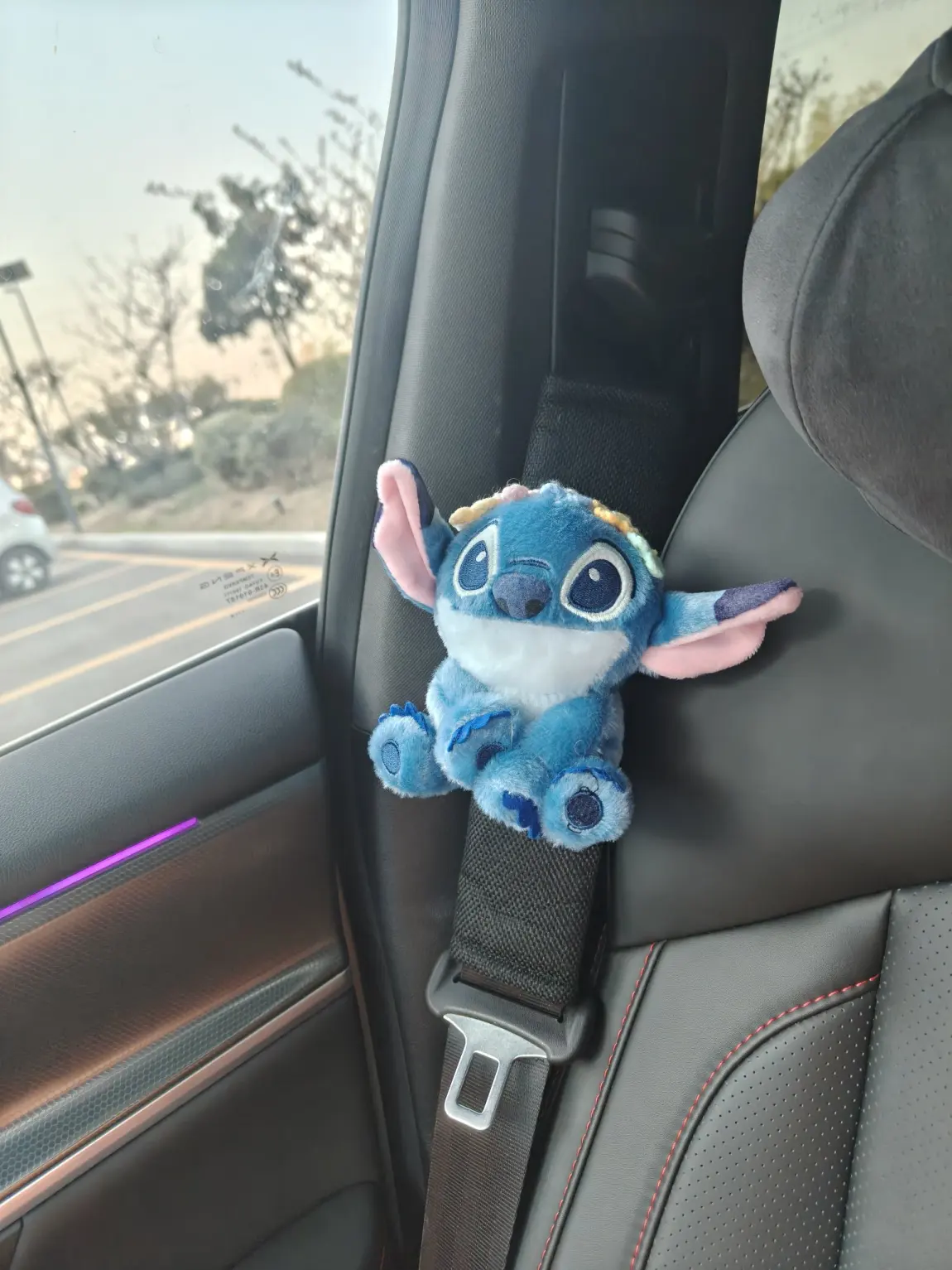 安全带卡扣挂着史迪奇公仔,毛茸茸的蓝皮肤摸起来像rua云朵☁️!晚上氛围灯亮起时,它歪头杀的样子能治愈所有堵车暴躁症~中控屏放歌时,小P还会跟着节奏闪灯,这互动感绝了!