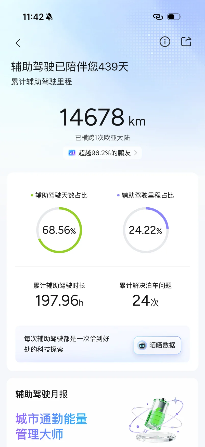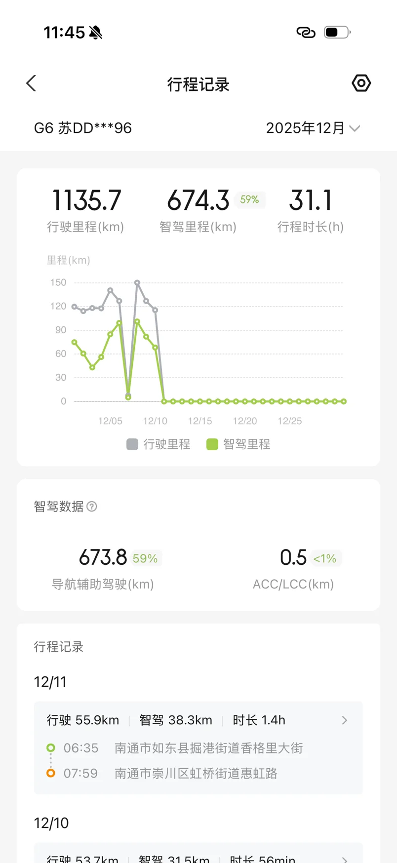 2025年,我的小鹏G6辅助驾驶已陪伴439天,累计辅助驾驶里程达14678km,超越96.2%的鹏友。其中2025年11月辅助驾驶里程1201.95km,天数占比83.33%,城市通勤中辅助驾驶有效缓解驾驶疲惫。截至12月,年度智驾里程超670km,导航辅助驾驶占比达59%,日常通勤(如南通如东至崇川路段)频繁依赖智驾功能。能耗方面,12月上旬平均行车能耗12.7kWh/100km,总行驶里程超740km,能耗表现稳定。此外,我还解锁智驾先锋LV.6、守护蓝天LV.6等成就勋章,智驾体验成为日常出行的核心助力。