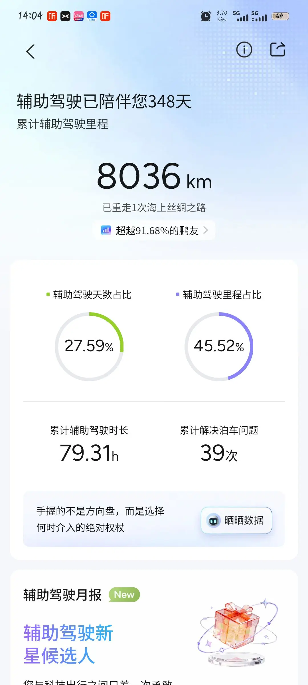 · 时间覆盖广: 累计辅助驾驶时长79.31小时,辅助驾驶天数占比27.59%。表明您在多种出行场景和周期内均信任并使用该功能。