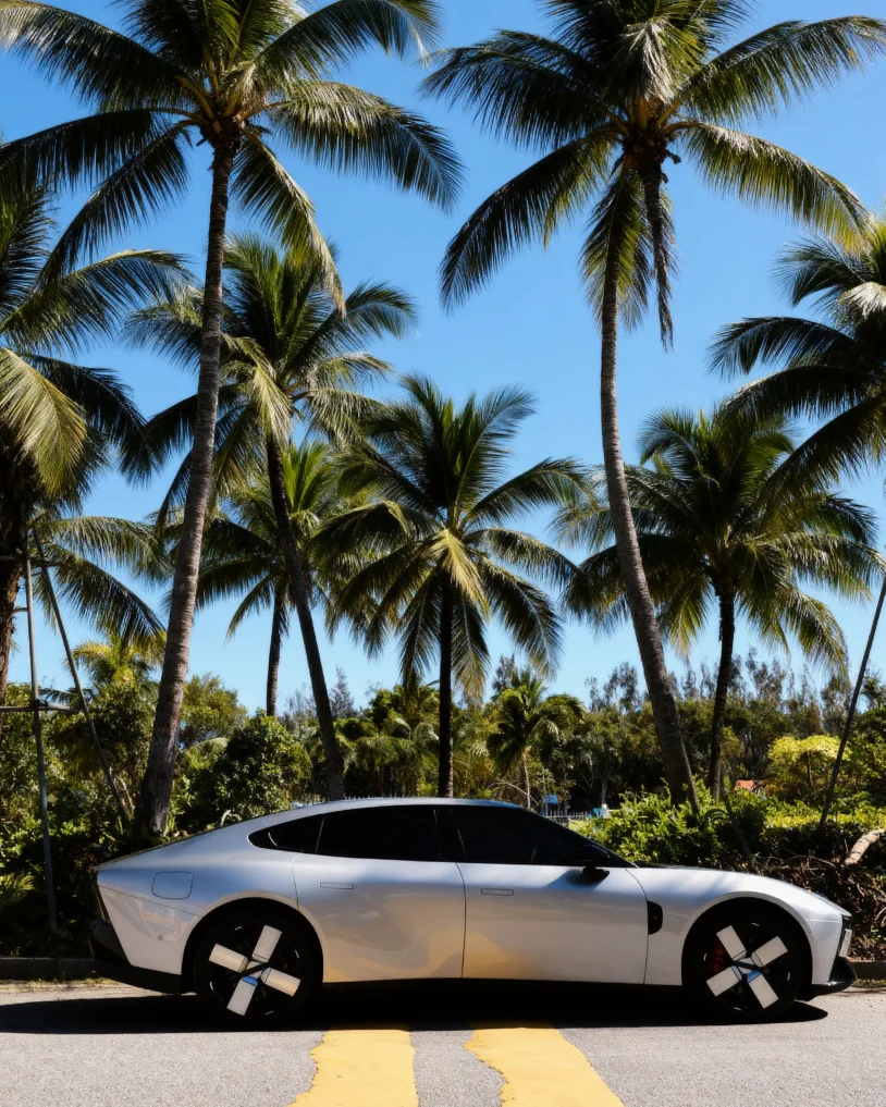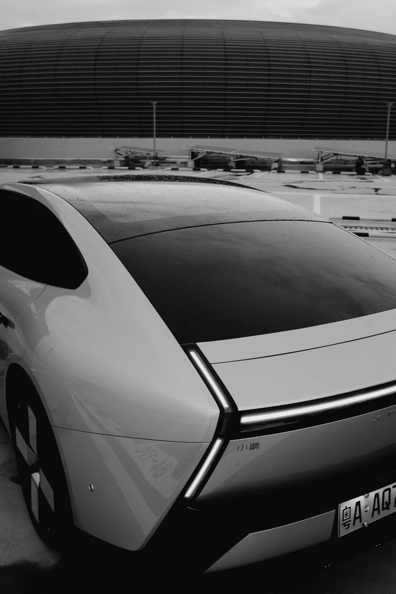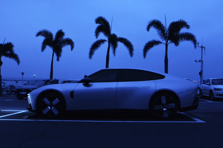 首先是光线选择,拍小鹏的车身线条,清晨或傍晚的黄金小时光最出片,柔和的侧光能勾勒出车身的流线型设计,像我拍这组林间黑白大片时,选了傍晚的散射光,弱化了环境杂色,让车辆的金属质感和线条感更突出;而夜景拍车灯和车身轮廓,用蓝调时刻的天色做背景,能让小鹏的灯光设计更具科技感,就像那张海边蓝调夜景图,椰林与车的轮廓相映,氛围感直接拉满。