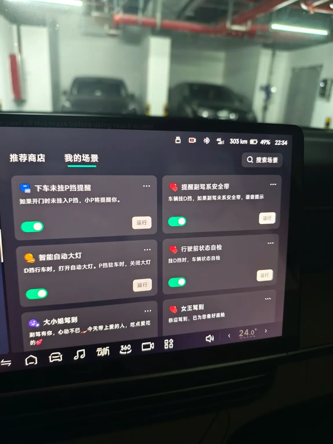 2)在车机中控屏幕找到智慧场景,这里可以设置很多我们能用到的温馨提醒,例如“下车未挂P档提醒”,这个就很友好,会提醒我们下车前需要把挂入P档,保护驾驶员和乘客的安全,提醒的非常好,还有一些其他的智慧场景,通常我设置运行了“提醒副驾寄安全带”、“智能自动大灯”、“行车前状态自检”,这是我比较喜欢且非常实用的智慧场景,这个也是小鹏汽车的一大特色功能,我们也可以自定义设计自己喜欢的智慧场景;