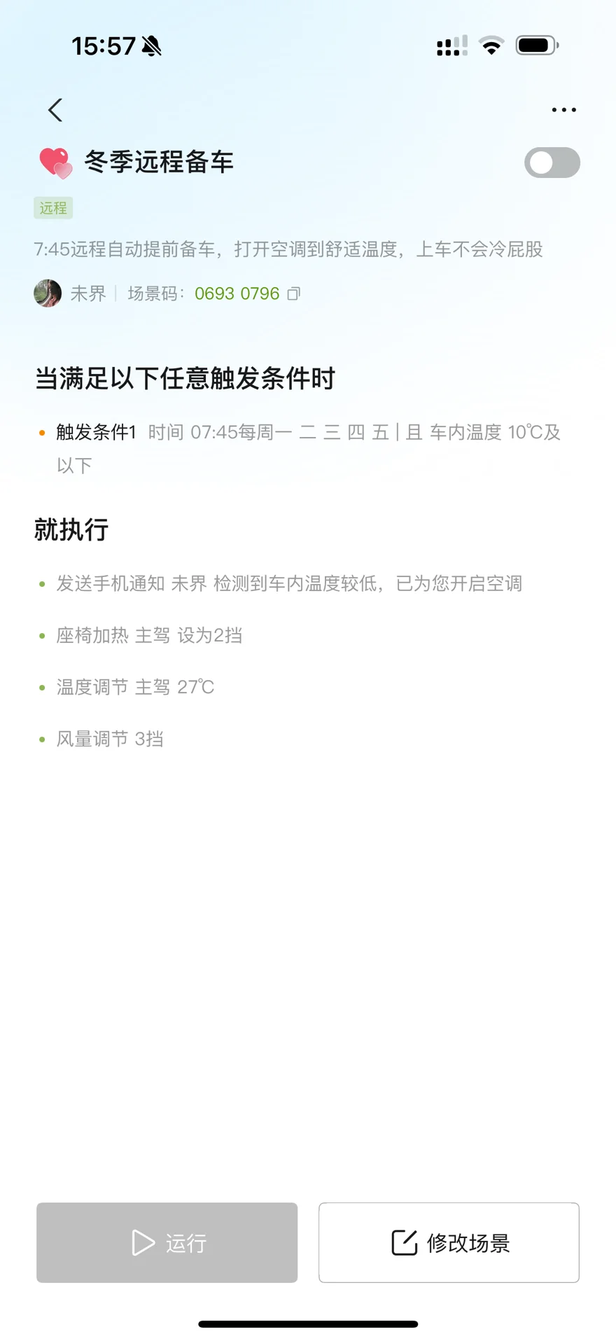 #我的2025小鹏印记# 年度功能种草冬天到了,早上总是因为寒冷艰难从被窝中爬起来,以前开油车的时候,总是要到车里后再打开空调然后忍受着低温艰难爬行,每次都要开了十来分钟,才能感受到暖意,手都是冻僵的状态。现在换了电车,小鹏p7+这个智能场景简直不要太好用,工作日每天到点固定对车内温度进行检测,监测到温度过低时变可以自动开启极速加热,无论是方向盘,还是座椅,亦或是车内环境都是温馨舒适的了,简直不要太棒嘿嘿