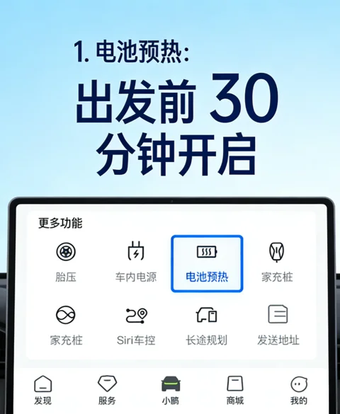 冬天电池升温很慢,这就导致能耗会变得比较高!想降低能耗?So easy,只要你的🚗插着充电桩,然后手机App点开,电池预热,记得提前30分钟开启哦!