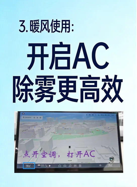 不用着急,你只需要在打开暖风除雾时打开AC。这样就可以利用空调的除湿功能,快速去除车内空气中的水汽,从而消除车窗雾气。