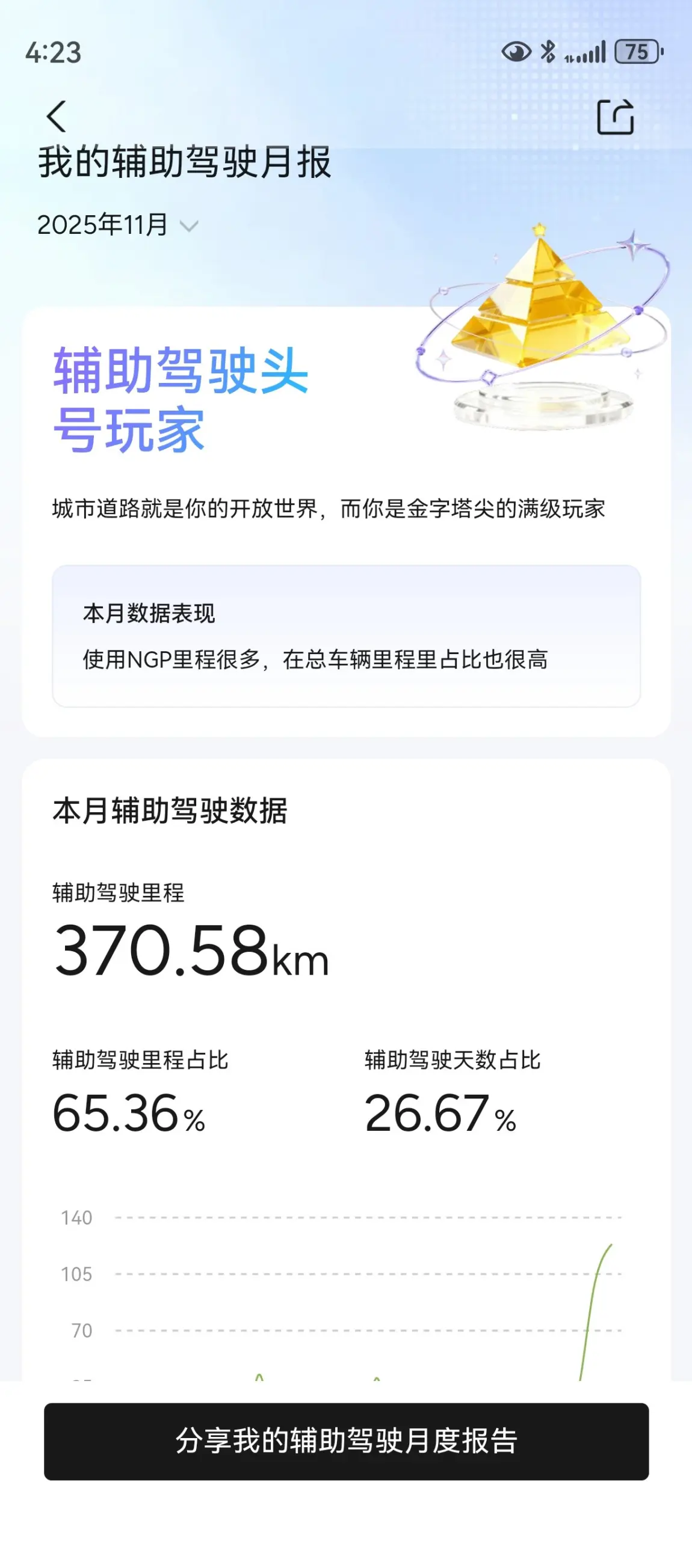 #11月用车总结# @鹏友俱乐部 11 月用车总结:本月行驶约 750公里。气温降低,驱动电耗从提车时的 14-16kWh 左右,续航表现中规中矩。日常通勤和几次周边出行,车辆启动、行驶稳定,加速性能不错,车内舒适性佳。但随气温下降,需关注电池状态,提前规划充电。整体对车辆满意度较高,期待冬季表现,希望它能继续可靠陪伴,为出行保驾护航