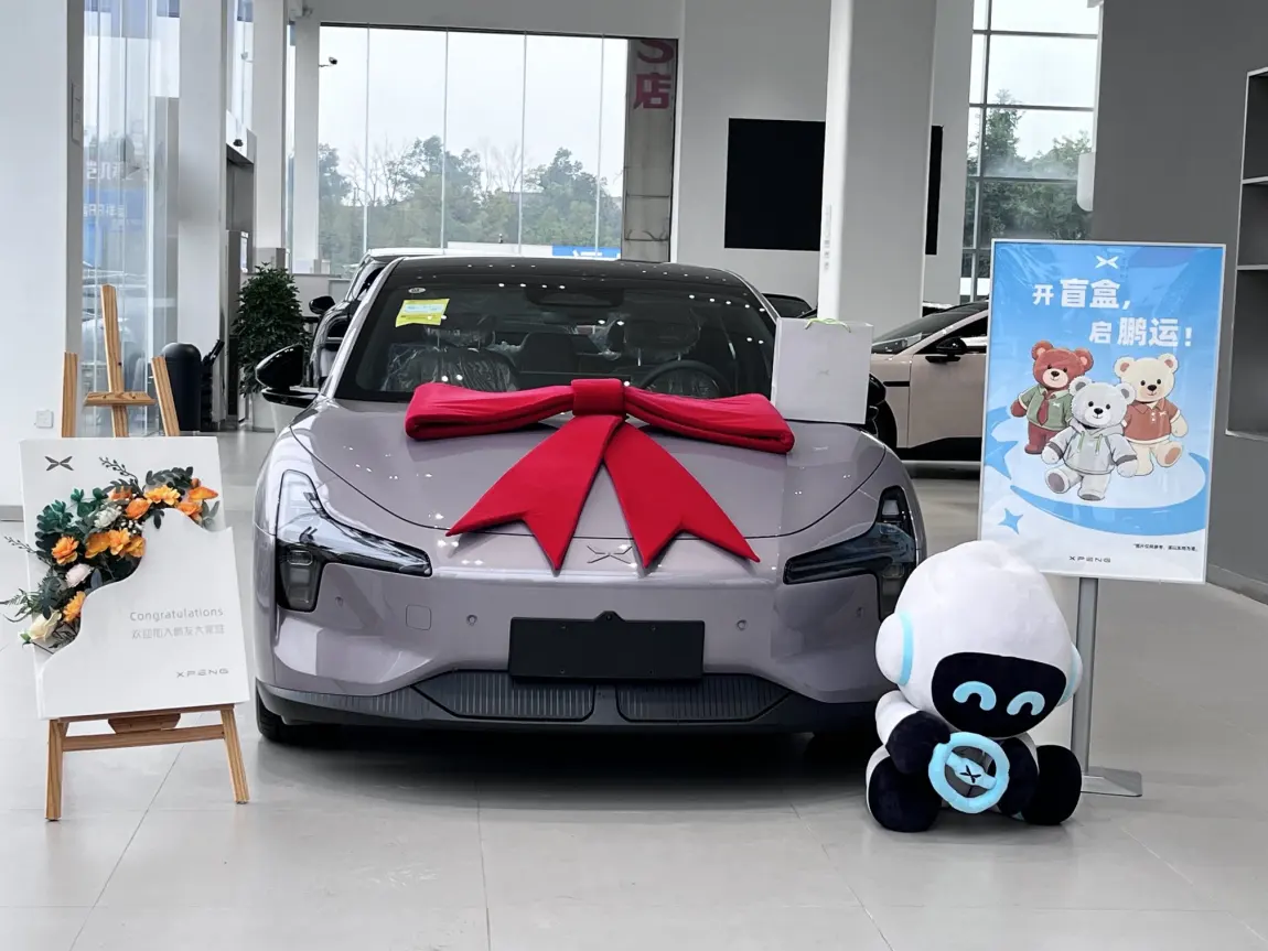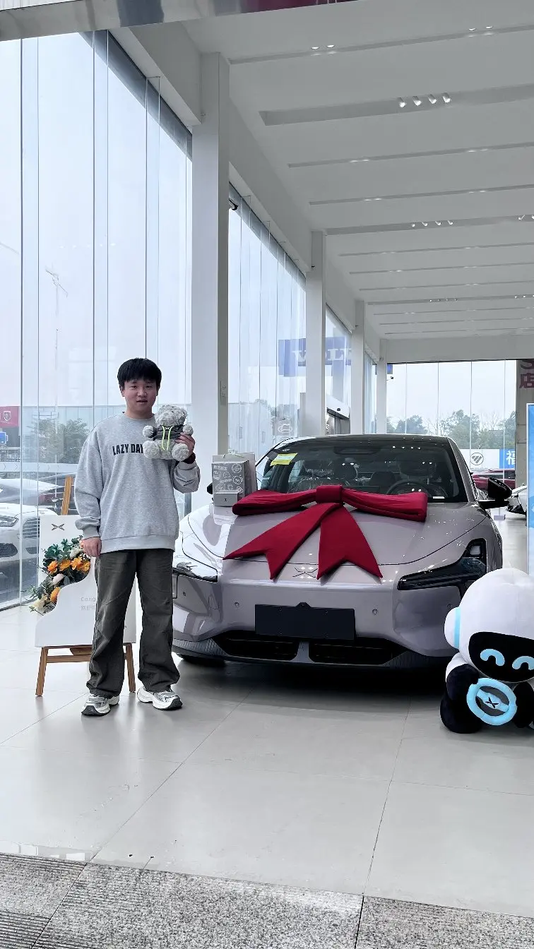 #我的提车作业# 提车记今日提车,浅灰小鹏M03静立展厅,车头红蝴蝶结醒目。左侧画架花束配“欢迎加入鹏友大家庭”,右侧海报“开盲盒,启鹏运”与小鹏玩偶相映。新车简约科技的设计,让我对未来出行充满期待,愿它伴我奔赴更多美好旅程。
