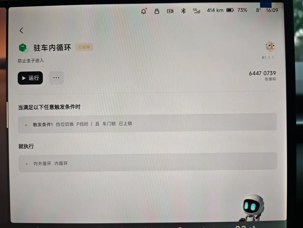 鹏友们有没有遇到空调跑出虫子的问题。这是因为驻车后没开内循环,虫子有概率通过空调口进入车内导致的,可以让智慧场景帮助咱们切换内循环。场景码:64470739