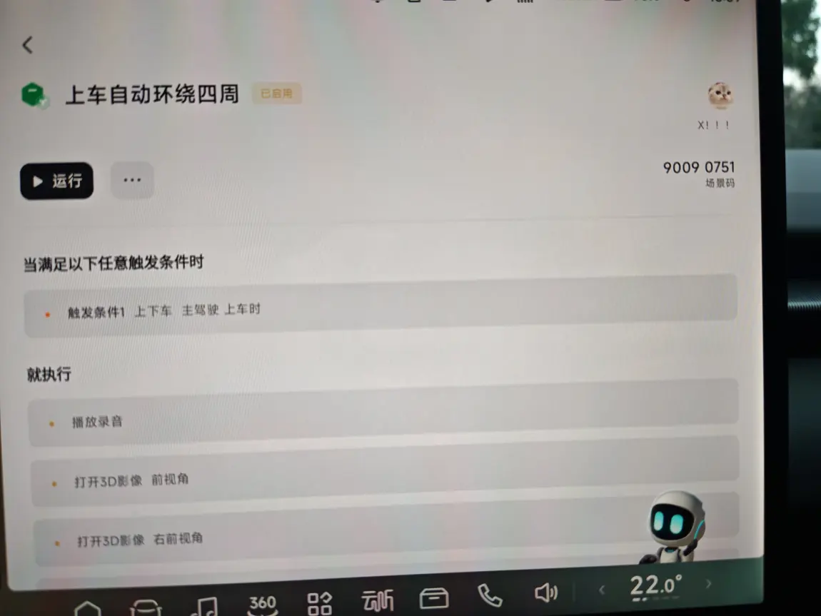 上车绕车观察是行车安全的重要一环,但我有时候容易忘记这一点,为了以防万一,用智慧场景上车时自动帮我观察一遍四周,可以很大程度提高起步的安全!场景码:90090751