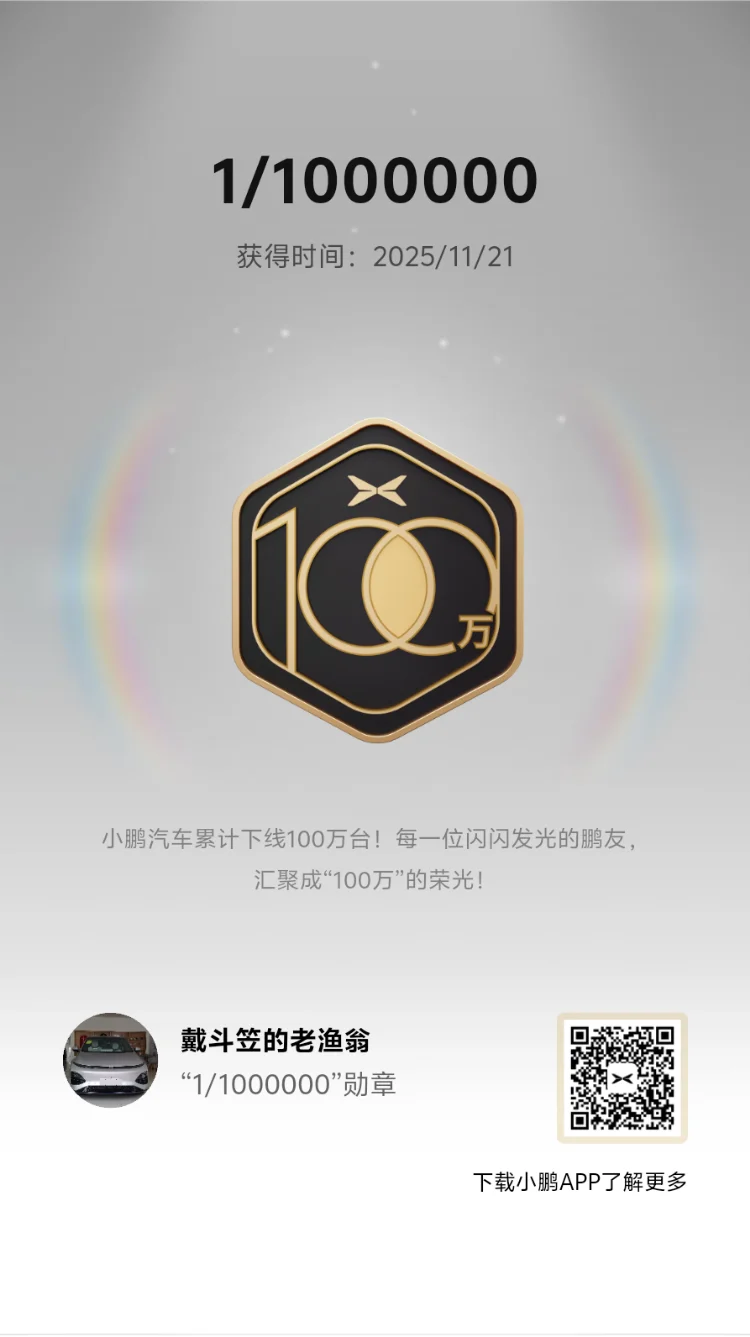 这枚【1/1000000】纪念勋章,既是小鹏售后靠谱陪伴的见证,也是鹏友们鲜活生活的缩影。@鹏友俱乐部