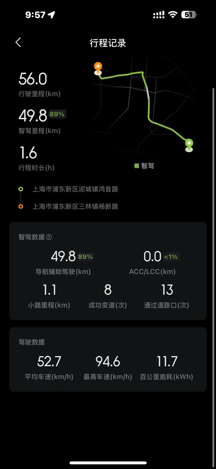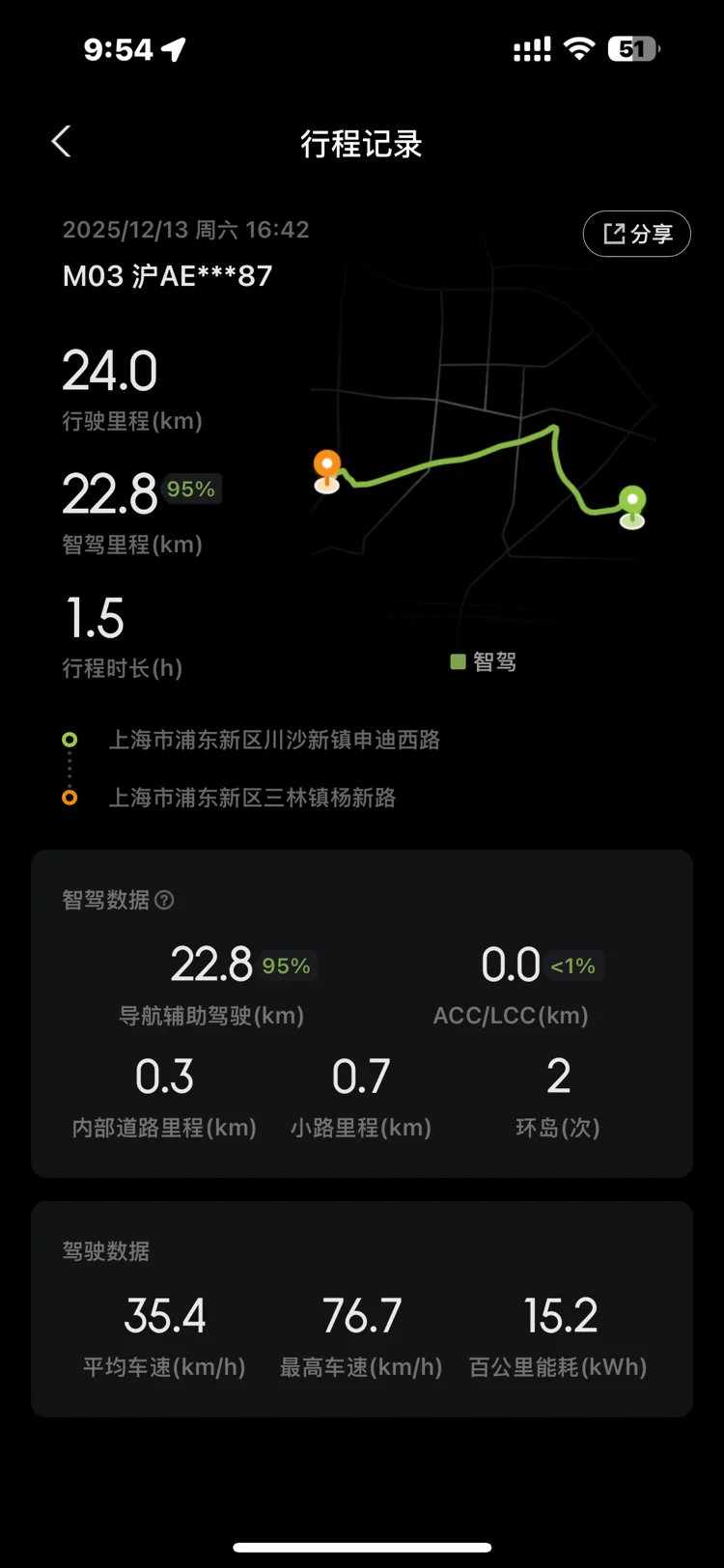 就拿今天的行程来说,从浦东川沙开到三林,24公里行程里,95%都是智驾完成的。环岛、小路都没在怕,能耗才百公里17.4kWh,太省了!全程下来只当了个“监工”,解放双手自由听歌🎶