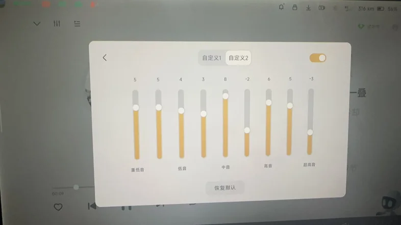今天分享一下平时开车超级高频使用的功能,听歌🎵,新P7有足足23个扬声器,默认的均衡器都是0,听着有点别扭,便开始着手自己进行调试,首先是重低音部分,设置了2和4,听节奏感强的歌曲时会适当有些力度,但不至于轰头;低音部分设置2和0,基本是微调,低音发沉;中音部分各档表现都不错,设置了3和0,比较柔;高音部需要体现高亢通透,听了比较多遍之后调节为4和3,感觉在不失真的情况下能更好的体现高音透亮,最后超高音调低为2,能比较好的声音保真,各花入各眼,平时听R&B比较多所以这么调,鹏友们可以根据自己听歌类型去调试到舒服的位置,车有60年代复古风格元素,搭配上贴纸及老歌,整体氛围营造是相当棒的;特别提一嘴,音源是XPAD上下载的Apple music,音质确实好几个档次,需要会员付费,而且每首歌消耗的流量比较高,在提车时就买了终身每月100G,好马配好鞍,建议和高流量包搭配使用#小鹏汽车、#小鹏p7、#我开车你听歌