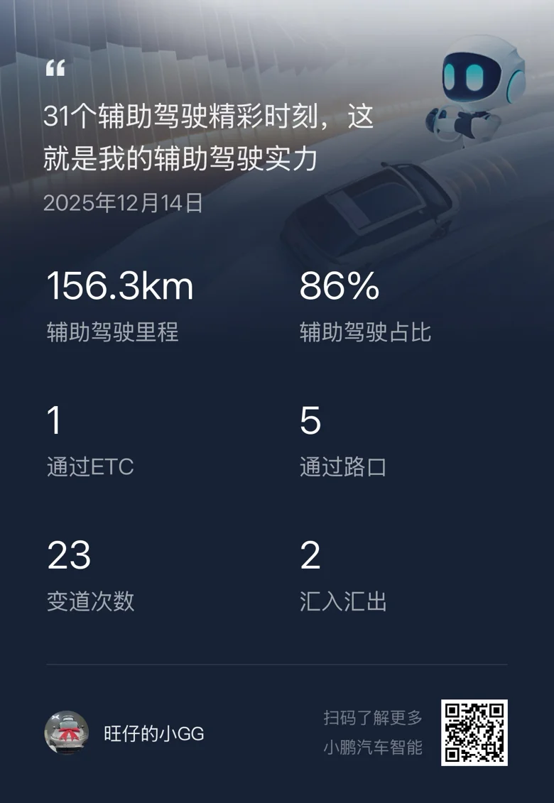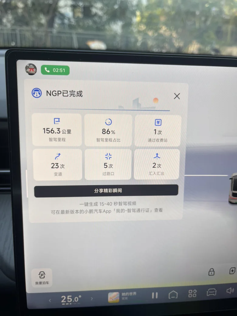 #小鹏G6# #智能辅助驾驶体验# 从驶入收费站开始开启NGP辅助驾驶,一直到开到目的地,全程接管次数少于10次,还有人机共驾功能真香!全程两次切换高速、一次驶出收费站,安全省心,尤其是遇到大车主动靠向另一侧,超越后再重新居中行驶,特别赞👍,下高速在国道上行驶20余公里,遇到道路养护也能紧跟前车借用对向车道后又重新驶入自己的车道,红绿灯停车、起步丝滑,唯一的遗憾就是圆圈红灯,明明允许右转,结果车子停下来了,还是依靠人机共驾才通过,期待后期OTA能够改变!