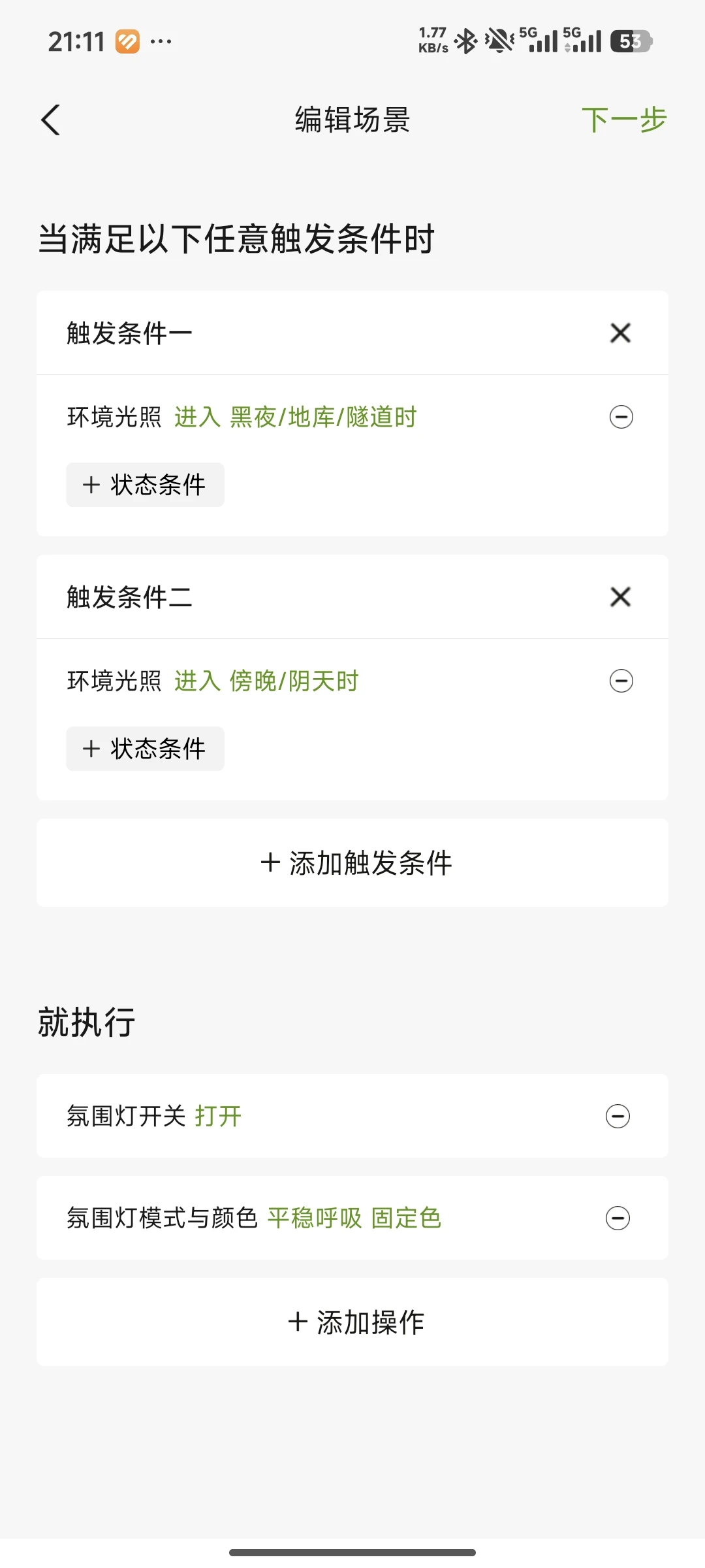 夜晚下班路上,检测到环境光线的变化,氛围灯自动开启,伴随着舒缓的音乐氛围灯随呼吸节奏而变化,治愈一整天工作带来的疲惫。