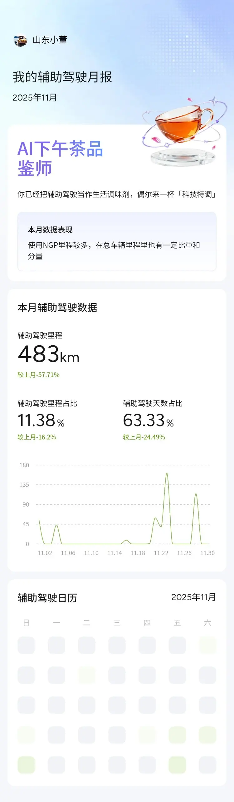 483公里的智驾里程中,高速NGP和城市LCC表现稳定,大幅缓解长途驾驶疲劳。