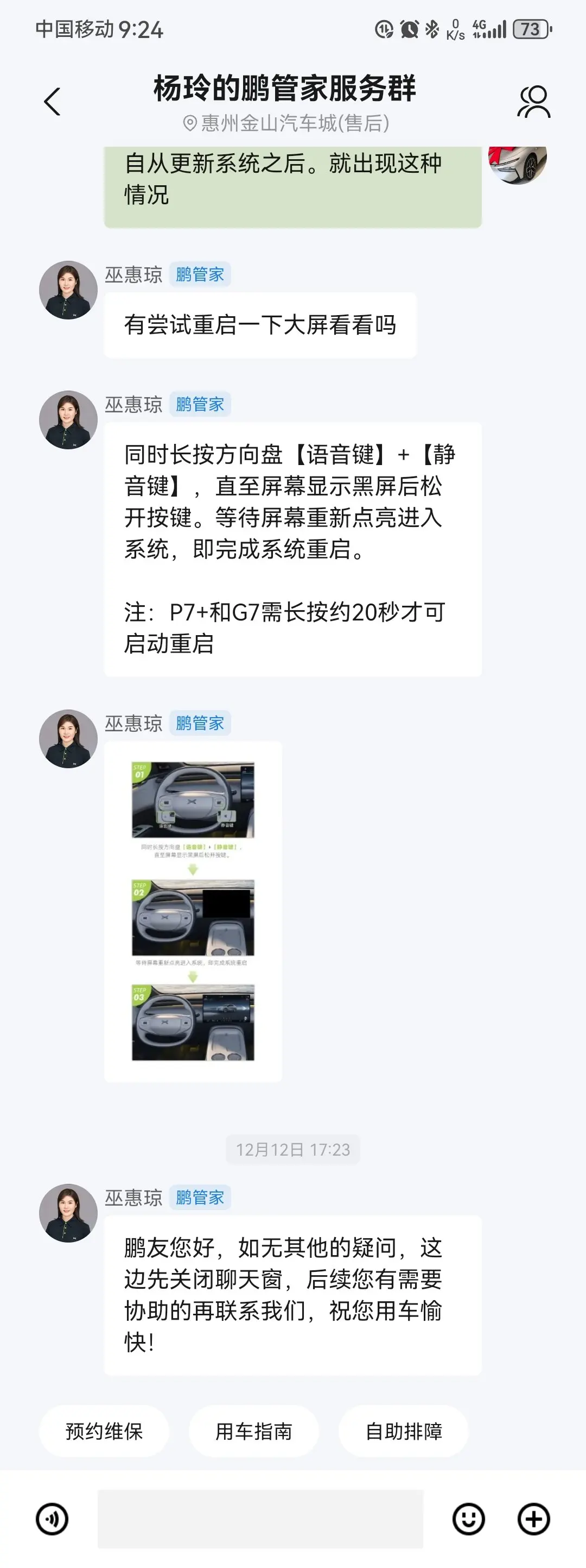 自从系统升级到5.8.5版本,发现开后备箱的时候,流媒体就会黑屏。等后备箱关闭的时候,流媒体又自动亮了,在各种犹豫与鹏友的沟通中最终选择了咨询管家,经过管家耐心指导操作,现已解决问题。小鹏远程诊断服务,时刻在线守护每一次出行。车辆异常自动预警,无需到店,云端实时读取车况数据,精准定位故障根源,快速给出专业解决方案。电池、电机、电控等核心部件全维度监测,隐患早发现、早处理,杜绝行车风险。一键发起诊断请求,专属工程师在线响应,远程优化车辆性能,高效解决小问题,省去奔波等待。智享科技护航,让用车更安心、维保更省心,全程无忧畅行每一段旅程。 , 来自#小鹏汽车 #智能远程诊断 #小鹏智能服务