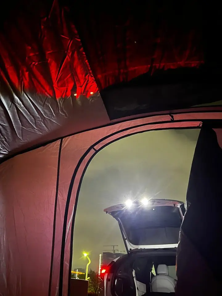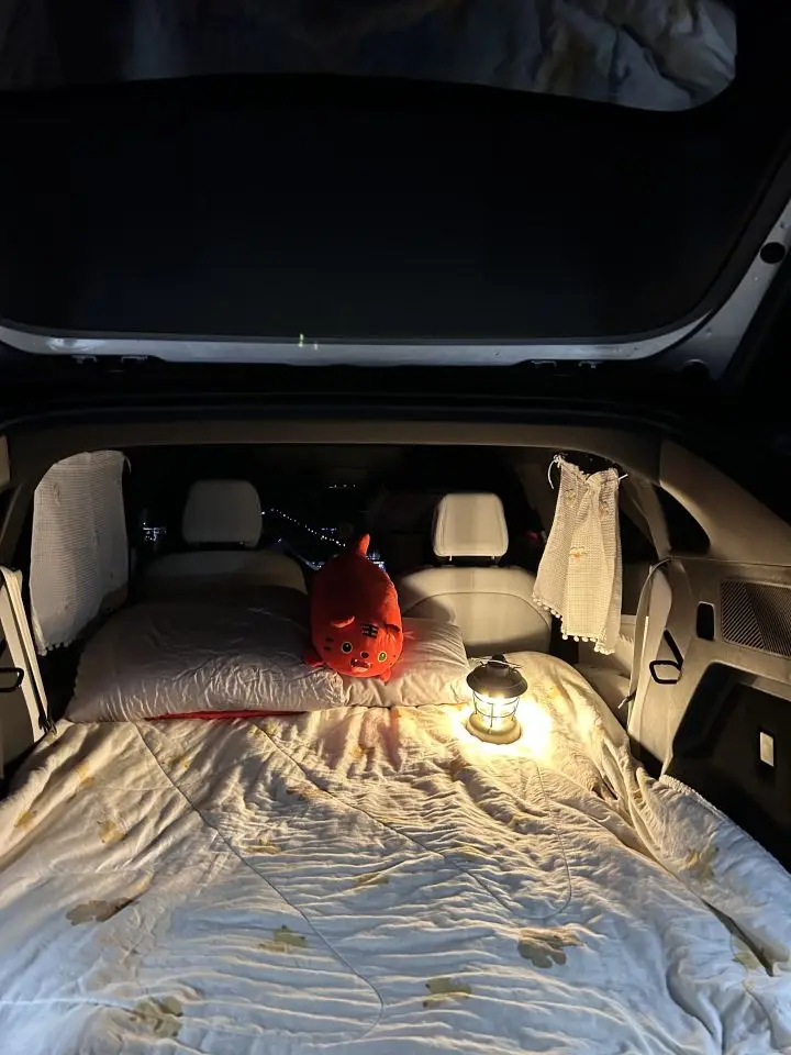 ⛺上周和家人去露营,先靠外放电功能支起了电烤炉和露营灯,煮茶烤肉全程电力拉满,再也不用愁户外用电问题。到了晚上想休息,喊了句“小P,打开睡眠空间”,主副驾座椅自动往前移,后排座椅手动放平后直接形成超大休息空间,铺上床铺瞬间就变成移动露营床。开启后空调自动切到AUTO档,车大灯自动关闭,还会播放轻柔的睡眠音效,躺在车里听着风声和音效,完全隔绝了户外的嘈杂。