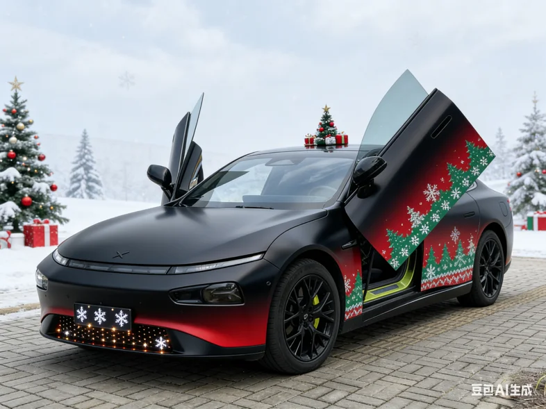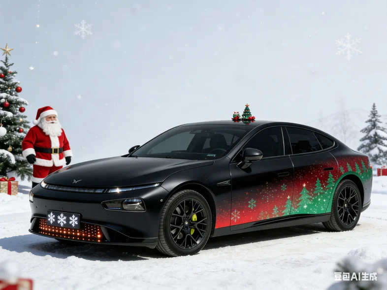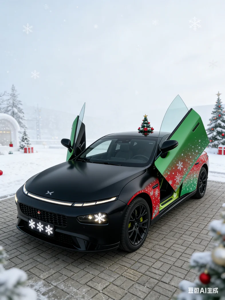 #我的圣诞魔力座驾# 紫电魅影撞上圣诞浪漫,哑光黑车身勾勒出小鹏的凌厉线条,红绿色圣诞花纹在侧面渐变流淌,前脸格栅的雪花灯效闪着细碎温柔,车顶的圣诞装饰俏皮点缀。圣诞老人悄然现身,与这台未来感座驾相拥,科技与节日氛围碰撞,解锁独一份的圣诞出行浪漫✨