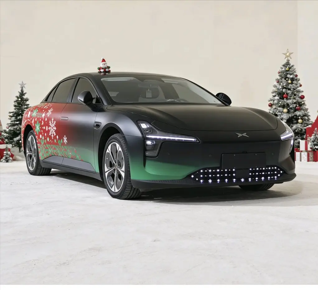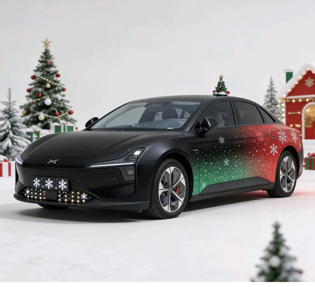 #我的圣诞魔力座驾# 用AI图像生成工具,先以写实车型线条为基础,设定哑光黑车身底色,再添加红绿色圣诞花纹渐变、格栅雪花灯效、车顶圣诞装饰,最后匹配浅圣诞场景,通过材质参数调试还原涂装质感。这样就做出来这个场景!
