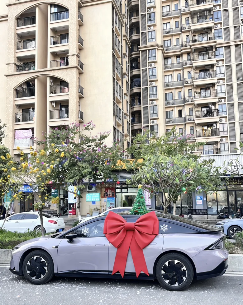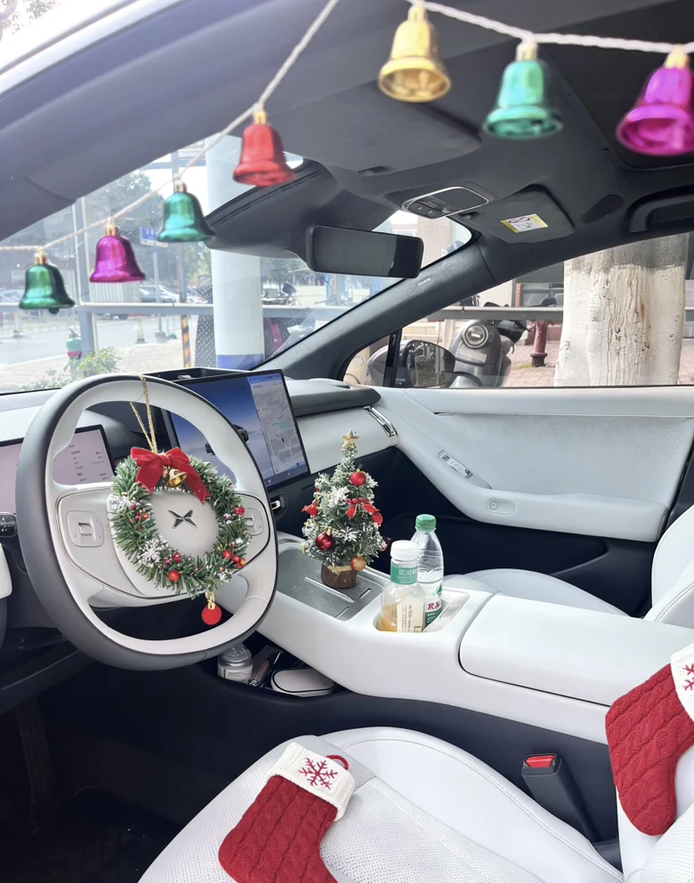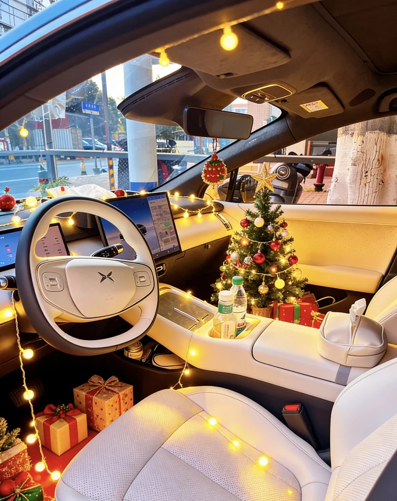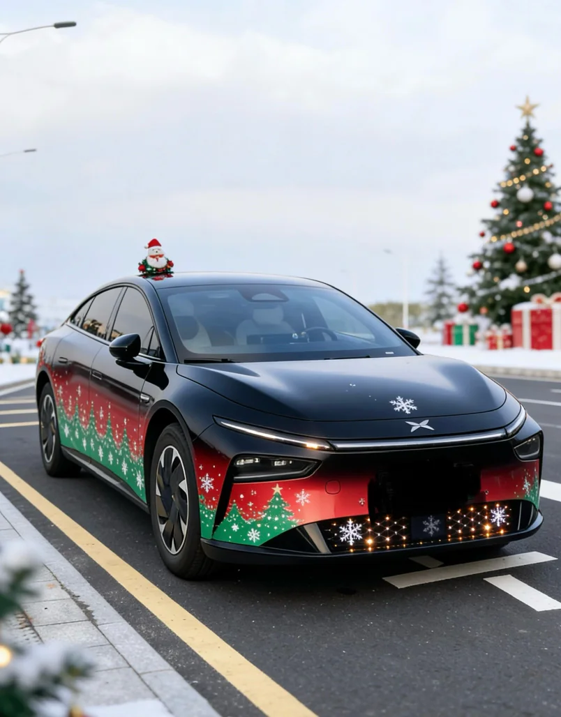 #我的圣诞魔力座驾# 小鹏P7+圣诞妆限时登场🎄麋鹿角在车顶俏皮支起星光灯串缠绕后视镜前挡画着戴圣诞帽的卡通鹏仔空气里都是糖果拐杖的甜香等一个红灯都像在童话路口载着礼物与暖意穿梭冬夜谁说仪式感很麻烦?P7+的浪漫,是每秒都有魔法在发芽✨#晒出你的「爱车圣诞妆」你的座驾扮好了吗?