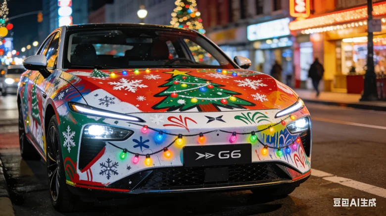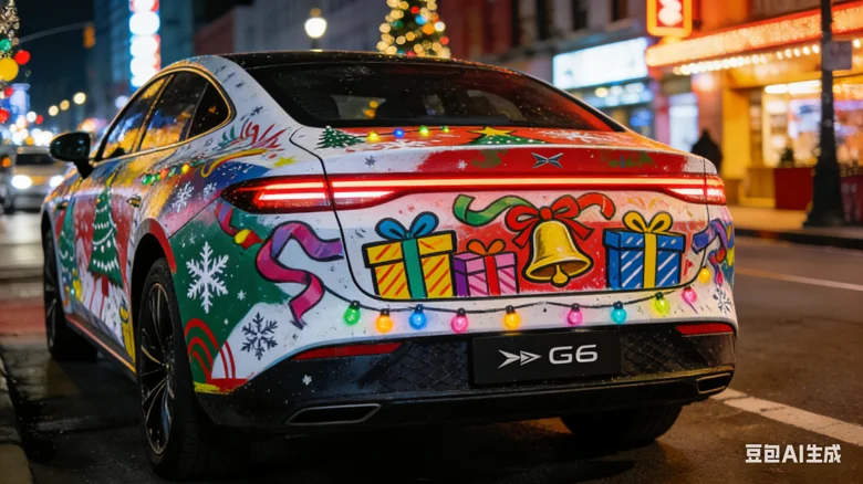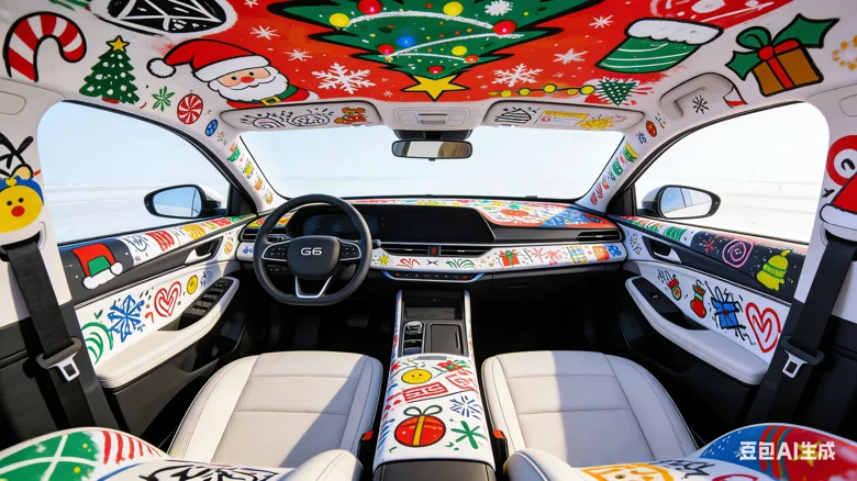 #我的圣诞魔力座驾# G6圣诞涂鸦!化身移动的圣诞画布:车身被多彩涂鸦包裹,驯鹿与雪花在车侧飞奔,霓虹般的线条从车头延伸到车尾,仿佛将圣诞夜的灯光都浓缩在车身之上。打开车门,内饰同样充满节日氛围,圣诞树、礼物盒与闪烁的灯光元素融入座舱细节,在科技感十足的中控与氛围灯下,呈现出既前卫又温暖的节日空间,让人仿佛一坐进车内,就驶入了一场专属的圣诞梦境。