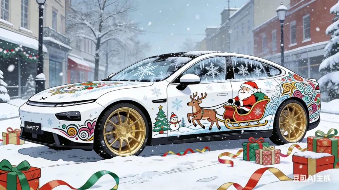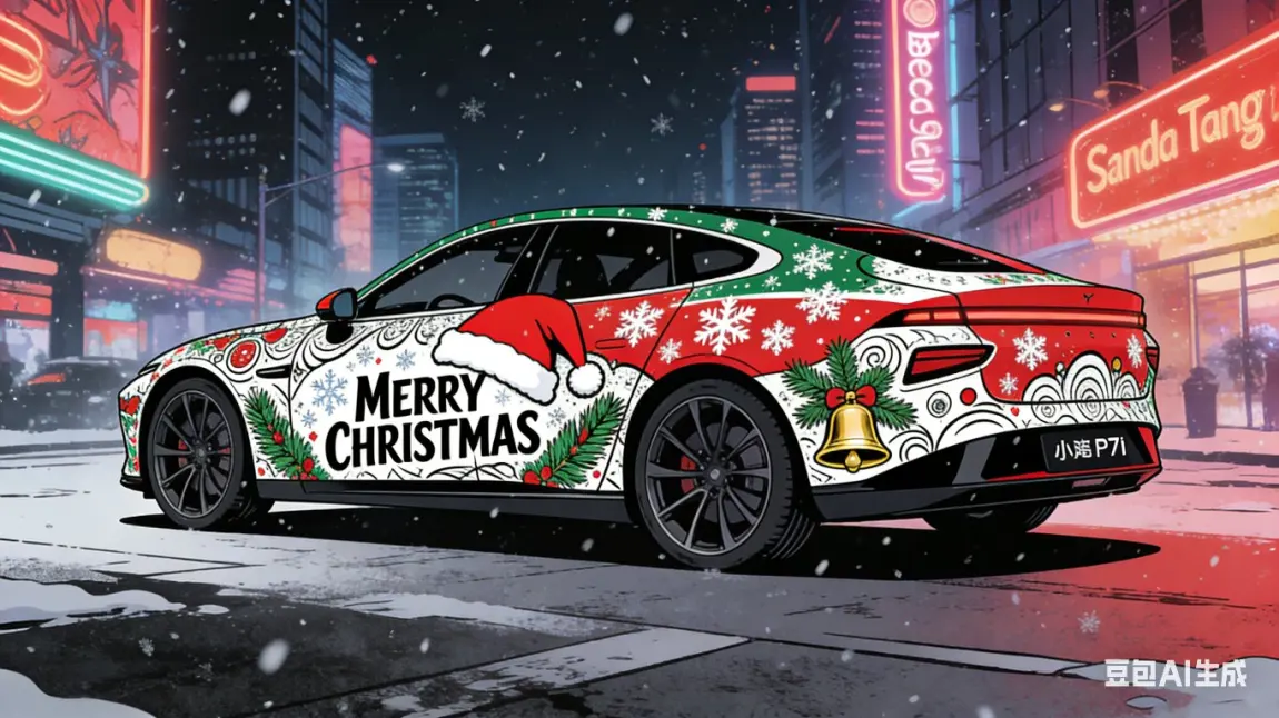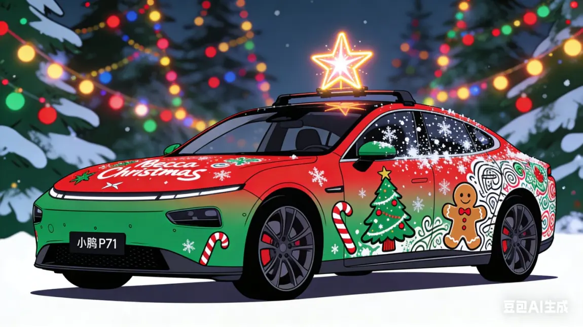 #我的圣诞魔力座驾# 小鹏P7的圣诞暖程 圣诞雪落,小鹏P7化身浪漫座驾✨。车头红蝴蝶结轻扬,座舱暖红松绿氛围灯流转,中控屏雪花壁纸映着暖意。解锁圣诞专属灯语,车灯随《Jingle Bells》律动,科技感裹着温柔。载满心意穿梭街巷,每一段路程,都是科技与圣诞的双向奔赴,藏着冬日最暖的出行浪漫🎄。