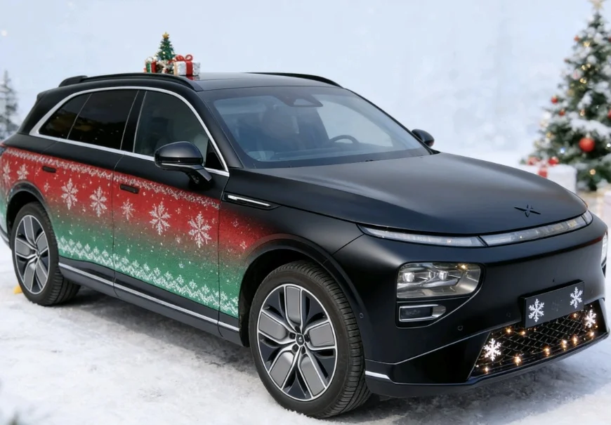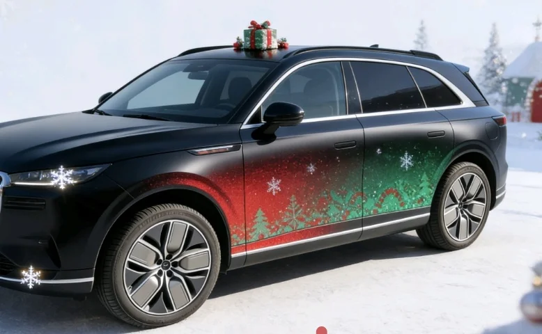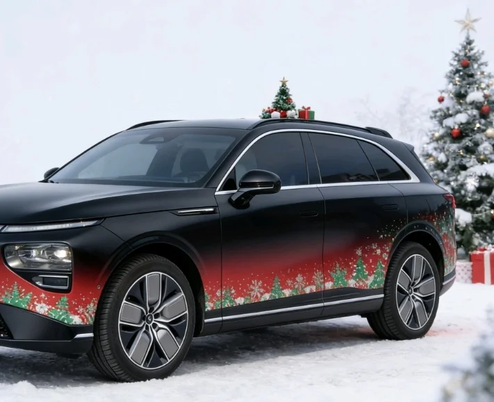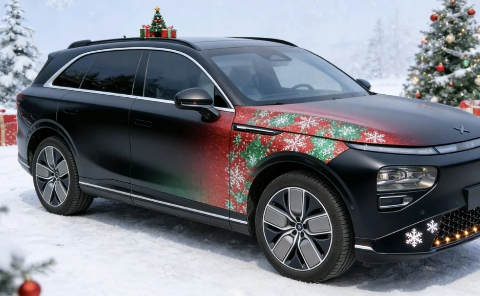 #我的圣诞魔力座驾# 这套圣诞涂装以哑光黑为基底,最大化凸显车型流畅的车身线条与硬朗的轮廓质感。车身侧红绿色圣诞花纹渐变自然,与车身曲面贴合;格栅雪花灯效精致,车顶迷你圣诞装饰点缀,搭配浅圣诞背景,保留了我的g9原车质感又营造出浓郁的节日氛围,非常帅气