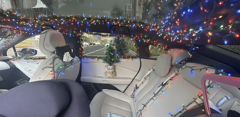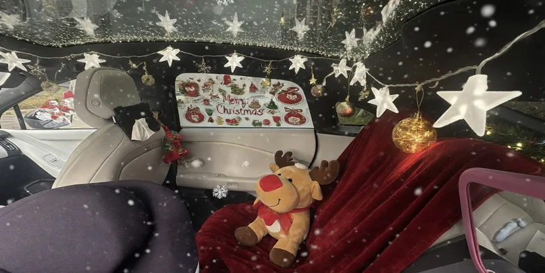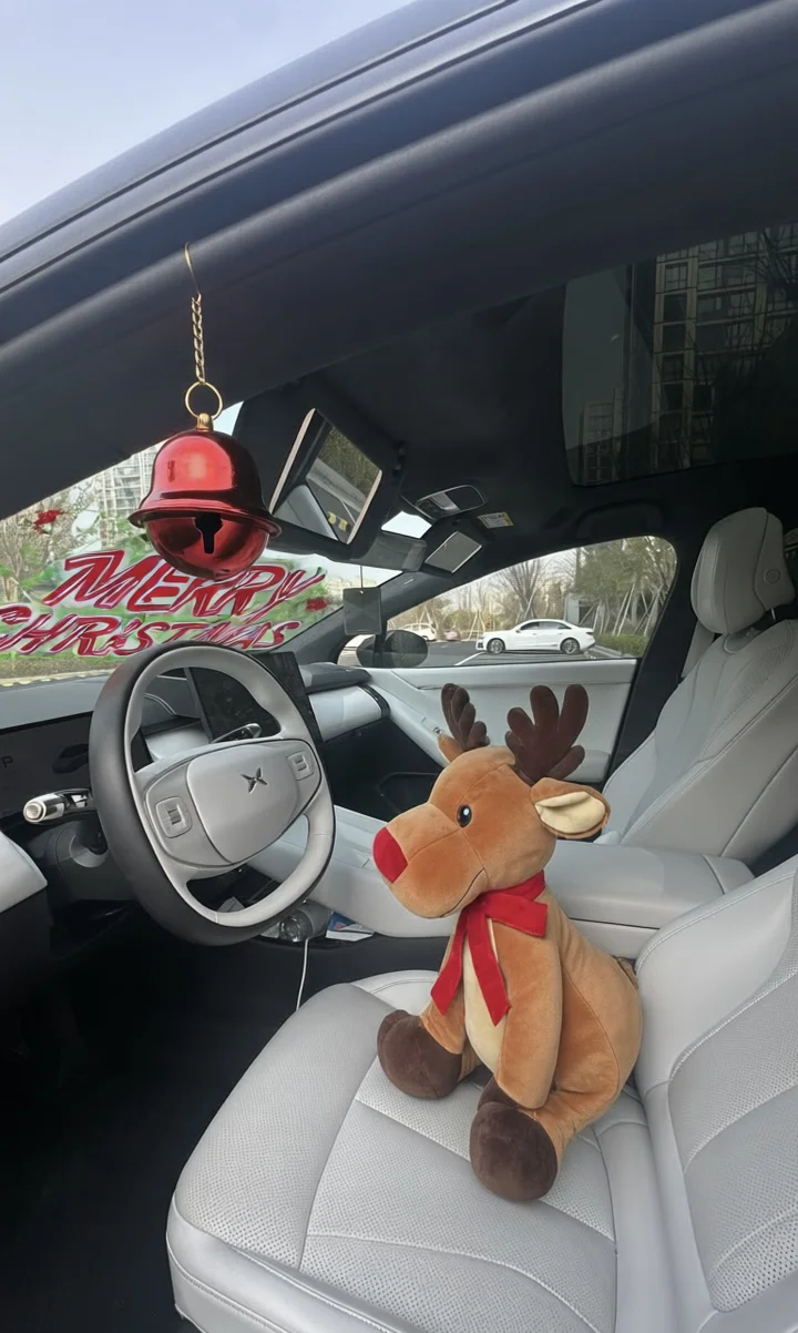 鹏友们,圣诞快乐,快来看看我的圣诞限定版小鹏吧,红绒毯+暖光铃铛,驯鹿布偶坐镇副驾,贴满“Merry Christmas”,启动瞬间,满天星灯与雪花投影点亮冬日童话!