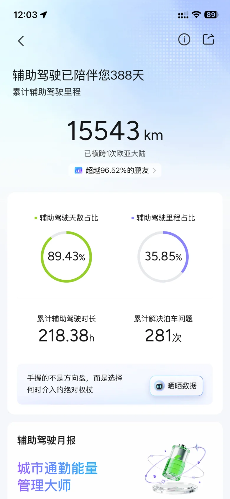 #我的2025小鹏印记# 提车1年零1个月,开了4.5万公里,辅助驾驶开了1.5万公里,自动泊车281次,跑了5个城市,真的很爽。买之前,我想不可以把控制权交给机器,买完后发现,在保证安全的前提下,打开辅助驾驶,能很好的减轻开车疲劳。有限度的信任和放权,也是拥抱科技的一种姿态。