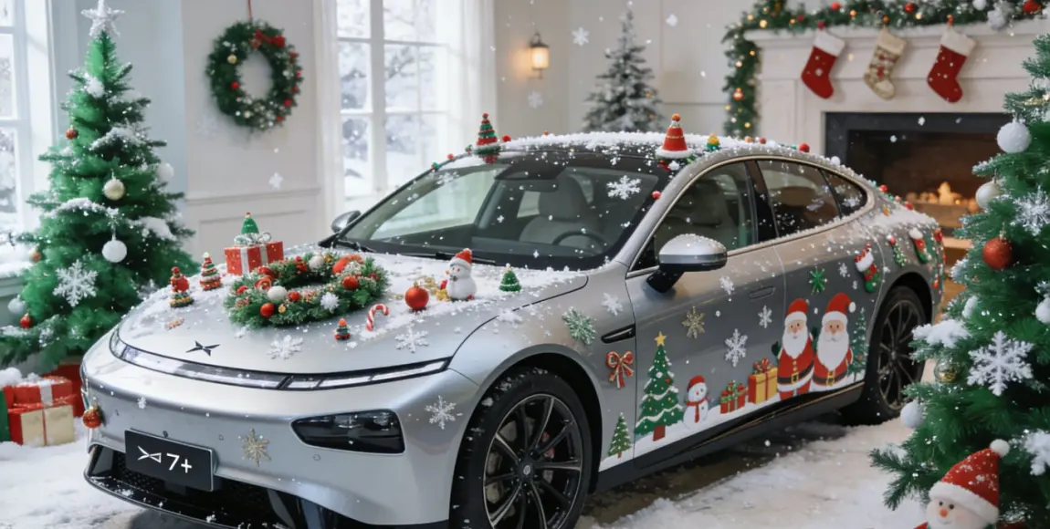 #我的圣诞魔力座驾# 圣诞氛围拉满的小鹏P7+谁能不爱!车窗贴了闪银雪花款“Merry Christmas”,后视镜挂了焦糖色小铃铛,轮毂盖贴了冰晶雪花贴纸,五分钟搞定的圣诞仪式感,开着我的银翼座驾过圣诞啦~🎄
