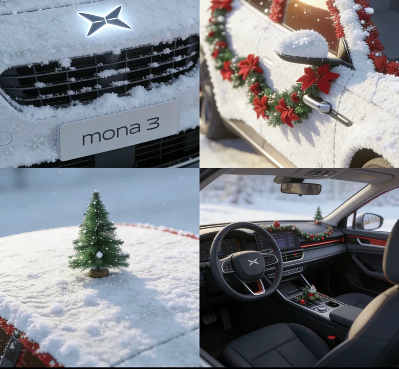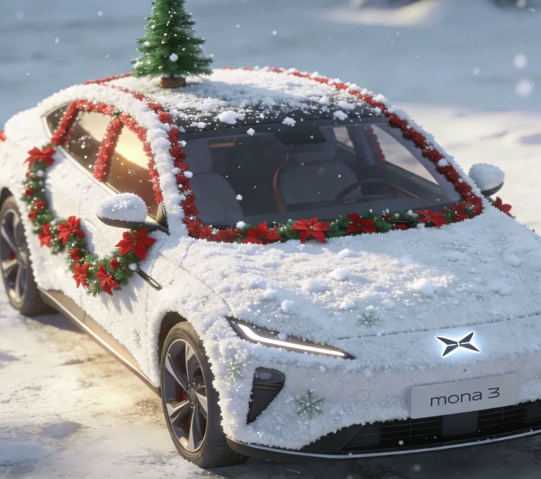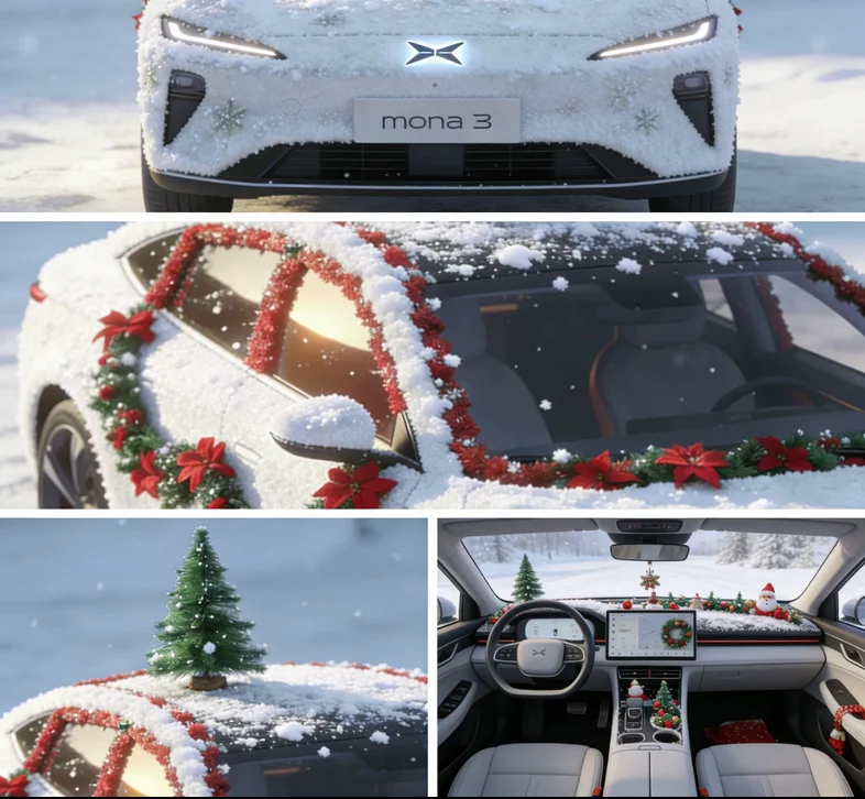 小鹏MONA 3被AI涂鸦裹上雪绒装,前后左右角度都藏着圣诞惊喜,给小鹏穿圣诞新衣,小鹏标在雪光里超亮眼~