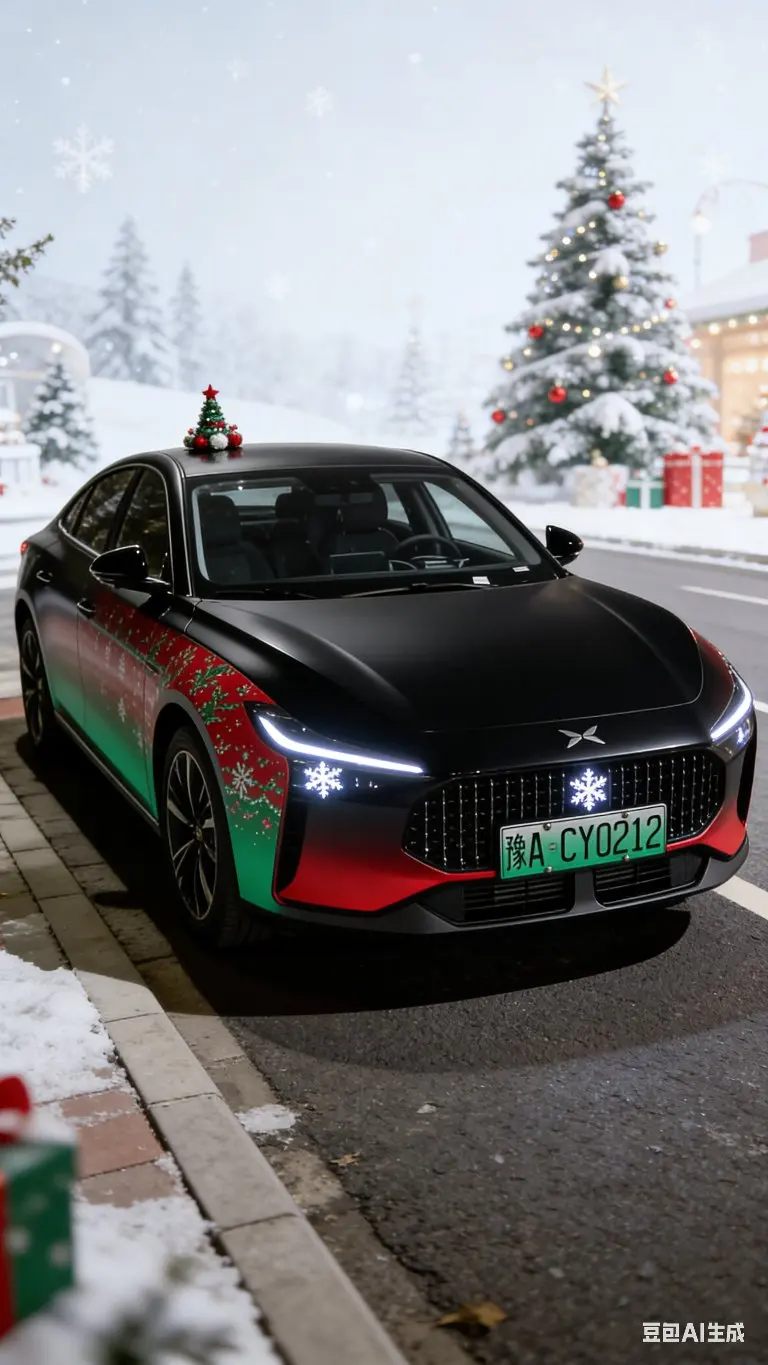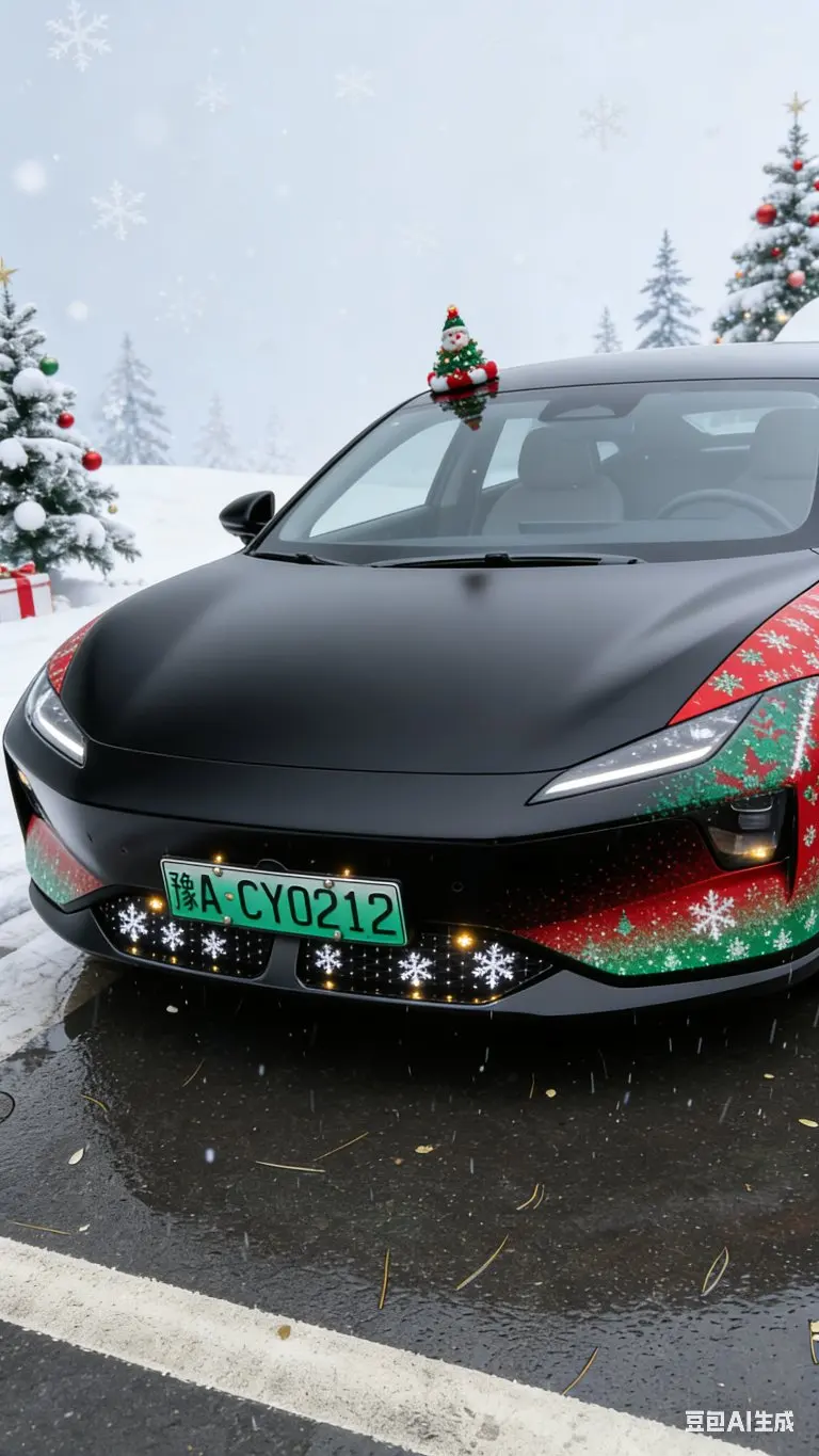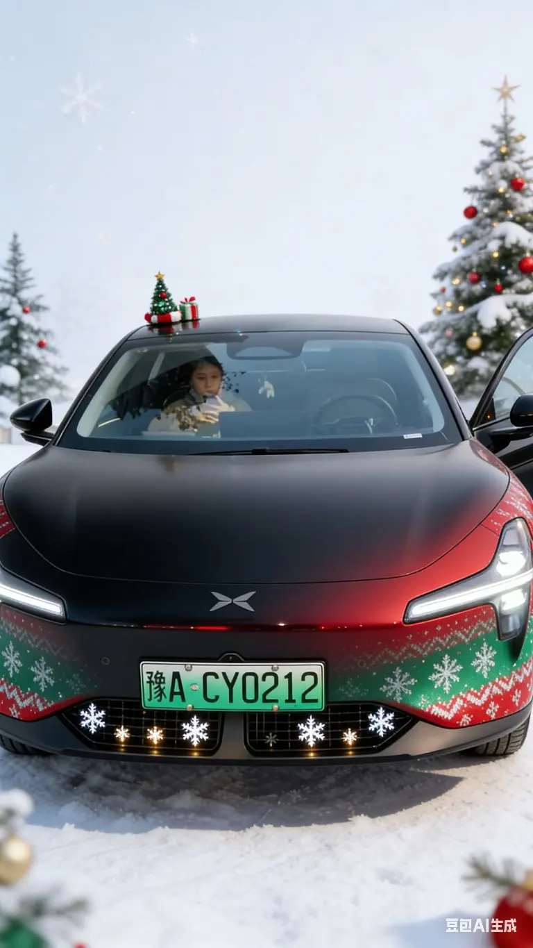 #我的圣诞魔力座驾# 圣诞夜的小鹏M03太吸睛!哑光黑车身打底,侧面红绿色圣诞花纹顺着车身线条渐变铺开,像裹了层节日限定糖霜。前脸格栅嵌满迷你雪花灯,点亮时细碎光点闪烁,车顶立着小巧的圣诞树装饰,还挂了串银白铃铛。背景是飘着细雪的街道,车灯映着橱窗里的圣诞彩灯,开在路上,连风都带着节日的甜意,每次停车都忍不住多看两眼~