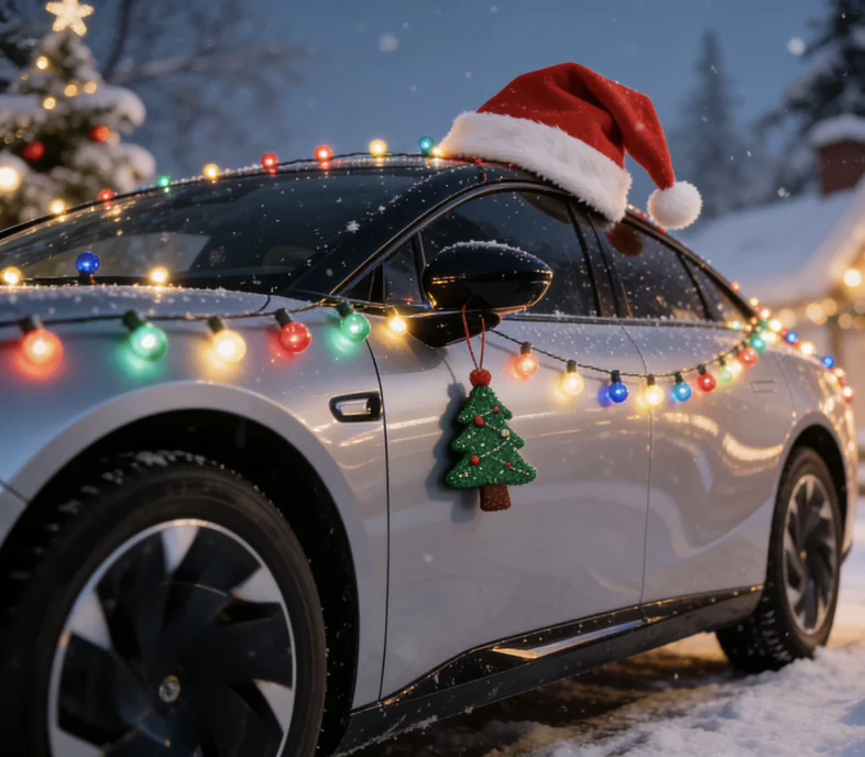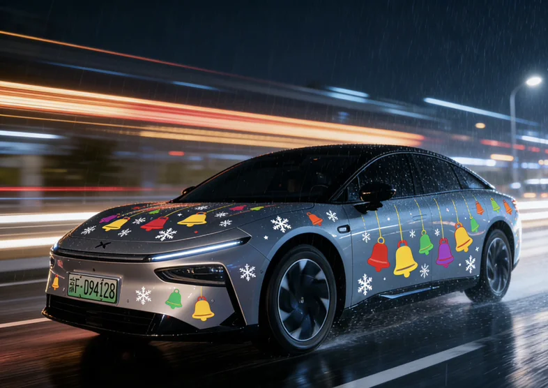 雨雪里的小鹏身披圣诞金饰,灯带裹上麋鹿绒边,轮毂旋成雪花涡,风挡凝着星芒贴,在城市霓虹里,载满节日暖光奔赴你。