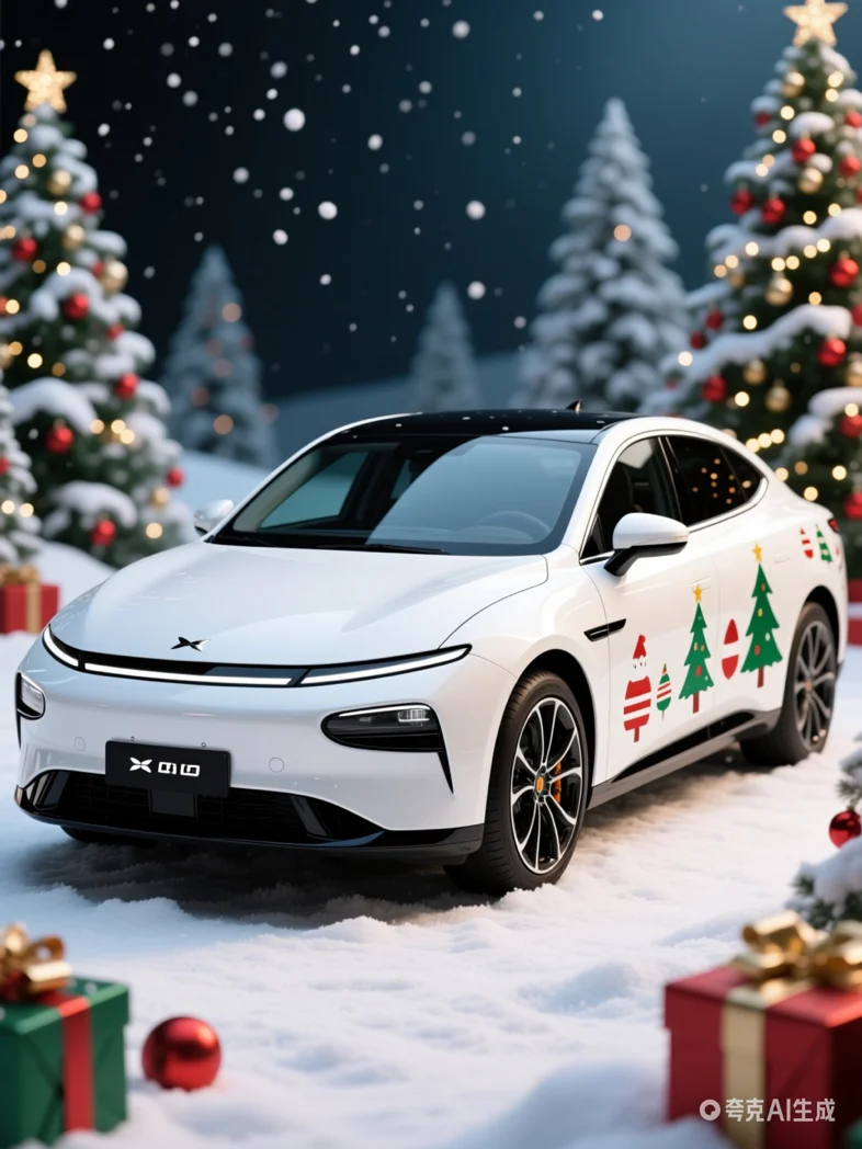 白色小鹏G6在雪夜中静立,车身被暖黄灯光勾勒出流畅线条。背景是挂满彩灯的圣诞树和飘雪的街景,整个画面如童话般温馨。