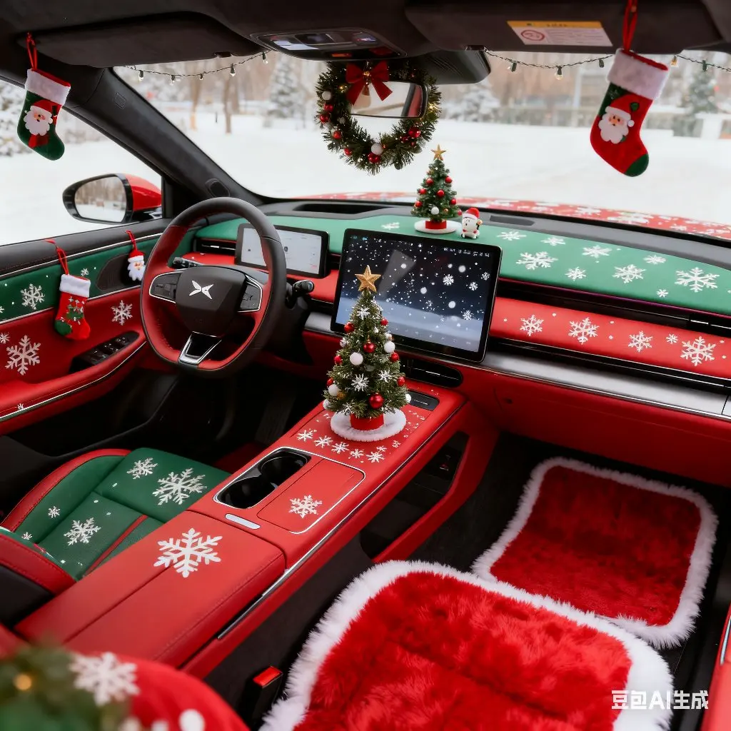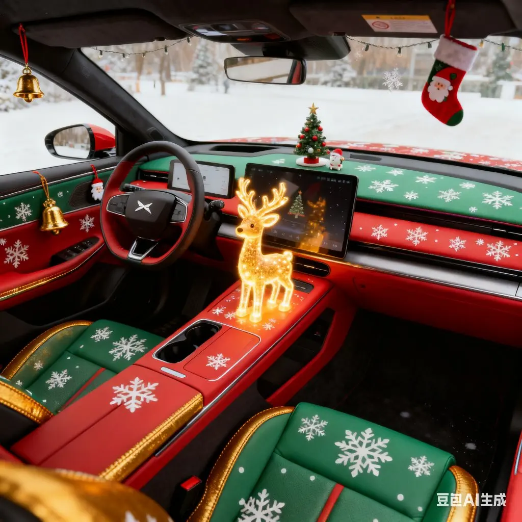 圣诞红与松枝绿交织座舱,中控饰条缀雪花纹样,座椅嵌麋鹿刺绣,氛围灯暖光流转,圣诞氛围感拉满,精致又温馨。