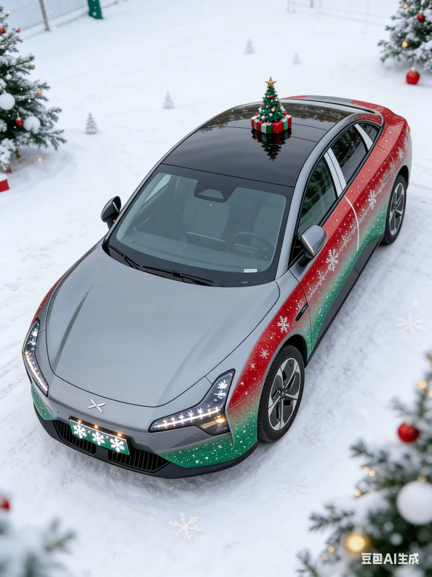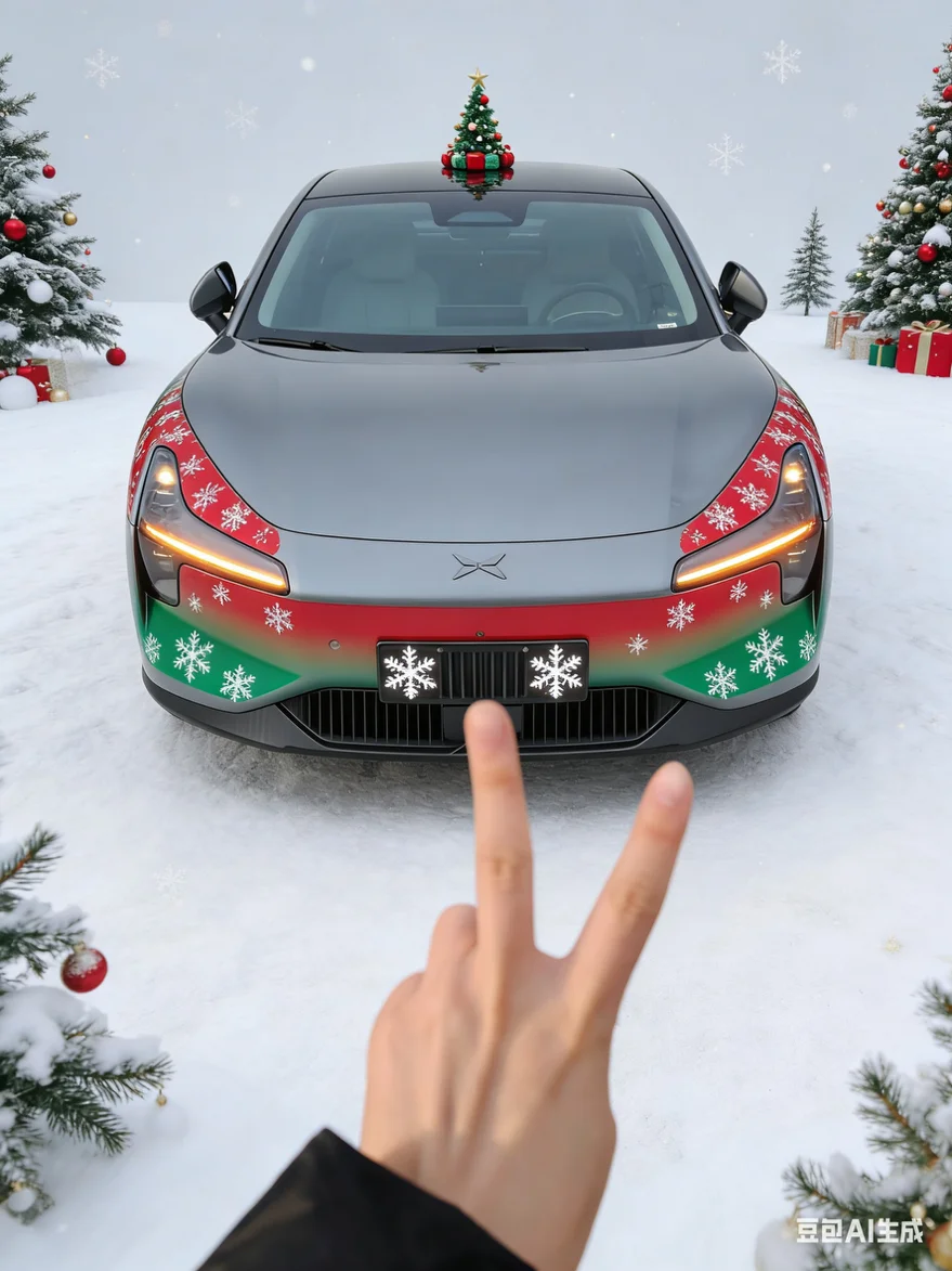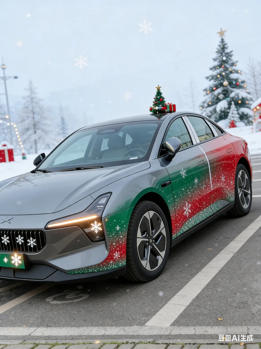 #我的圣诞魔力座驾# 圣诞魔法降临小鹏MONA 03!红绿色花纹沿低趴轿跑线条渐变,格栅雪花灯效闪烁,车顶圣诞装饰灵动吸睛。隐藏式门把手与星舰灯组呼应,AI智能加持下,每一次出行都满是科技感与节日浪漫,奔赴冬日美好。