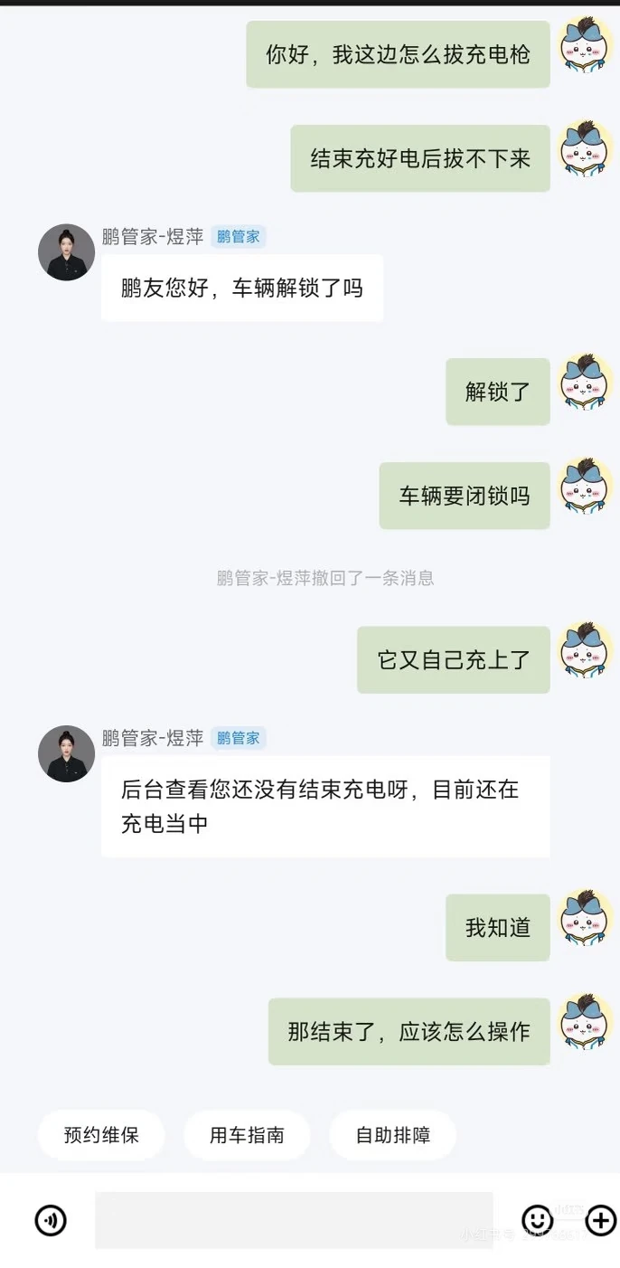 作为刚提车的小鹏新手车主,第一次去充电桩充电就闹了个小乌龙!充完电后按了充电桩上的解锁键,枪头却纹丝不动,捣鼓了 10 分钟还是没拔下来,眼看赶时间,急得我直冒汗,赶紧打开小鹏 App 联系客服。没想到客服响应速度超快,听完我的情况后,先帮我远程排查是否是车辆锁枪功能未解除。没多久,App 上实时显示 “正在检测车辆充电系统”,显示我正在充电,客服再在车机上点击 “解锁充电枪”。按照指引操作后,果然听到 “咔哒” 一声,枪头轻松拔下来了!第一次充电还是太狼狈了,告诉我后续遇到类似情况可以通过 App 远程解锁,还发了详细的充电操作指南。新手车主遇到问题完全不用慌,远程服务高效又省心,这波体验必须给满分💯 #小鹏汽车、##小鹏智能服务#小鹏MOT服务