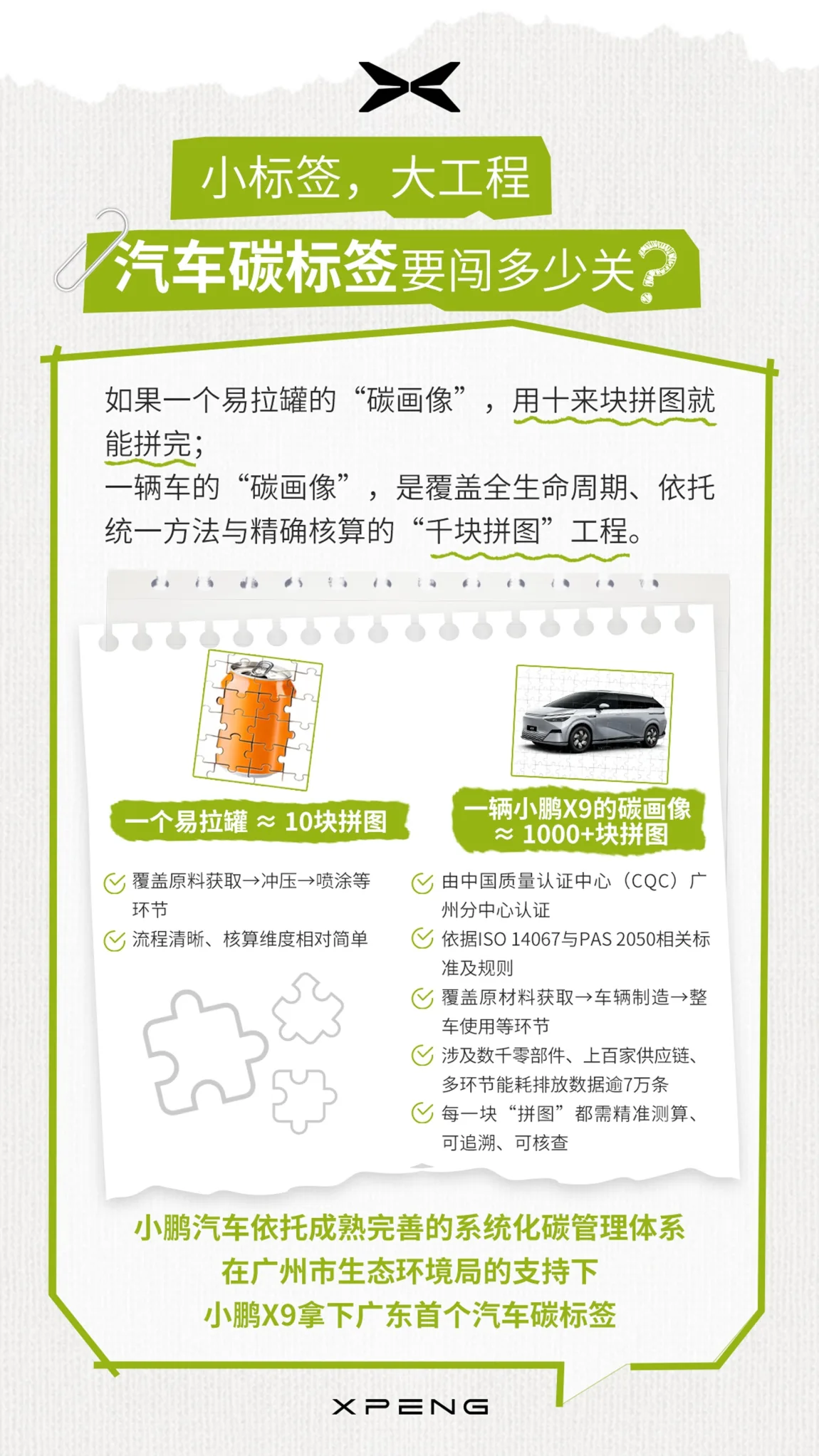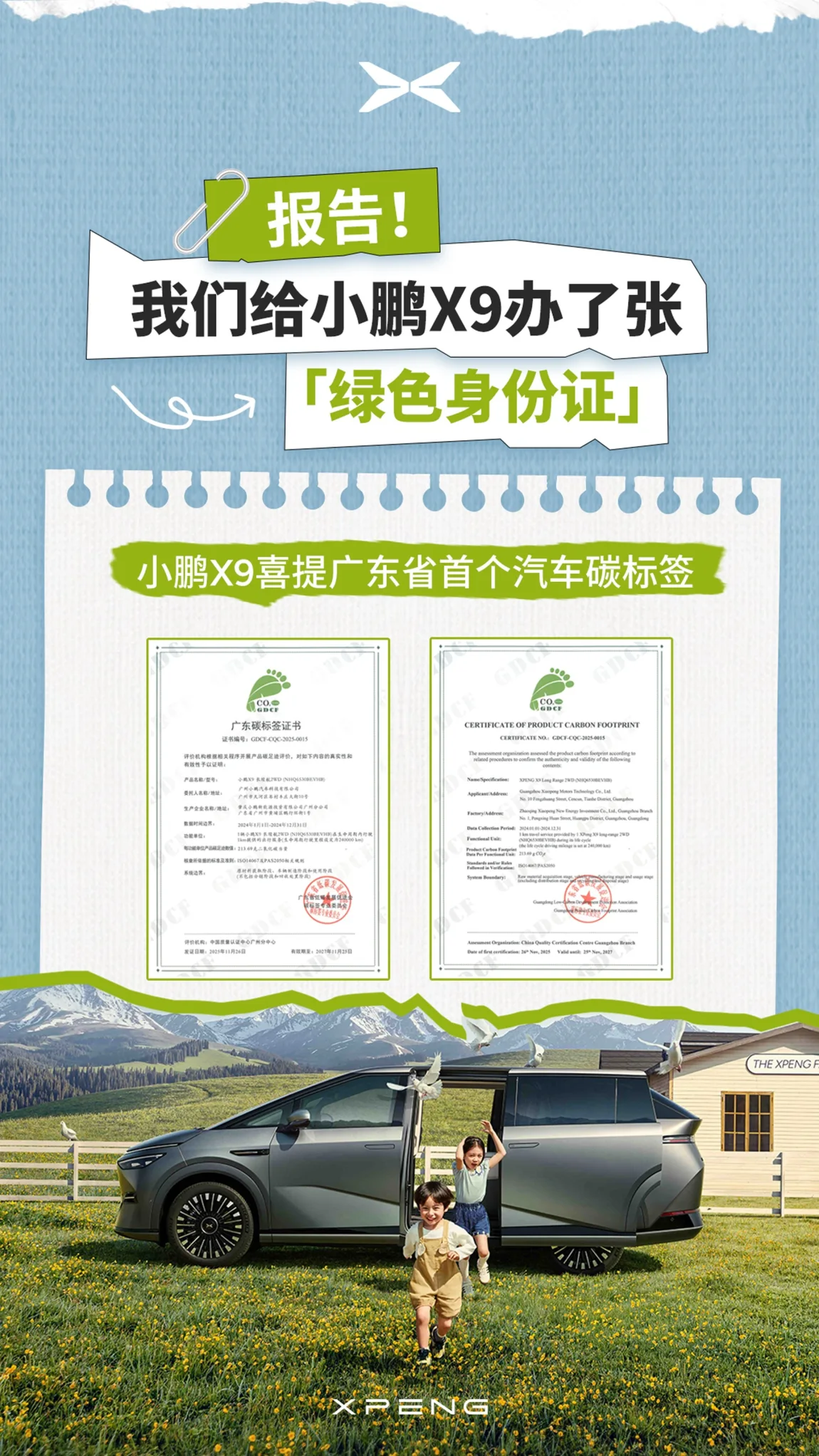 报告!我们给小鹏X9办了一张「绿色身份证」小鹏X9,喜提广东首个汽车碳标签🏷️这张“绿色身份证”,就像食品的营养成分表、电器的能效标识,展现产品的环境友好程度,也是我们对绿色出行的承诺与实践。践行低碳,始于点滴。期待与更多鹏友一起,开启更多绿色旅程~