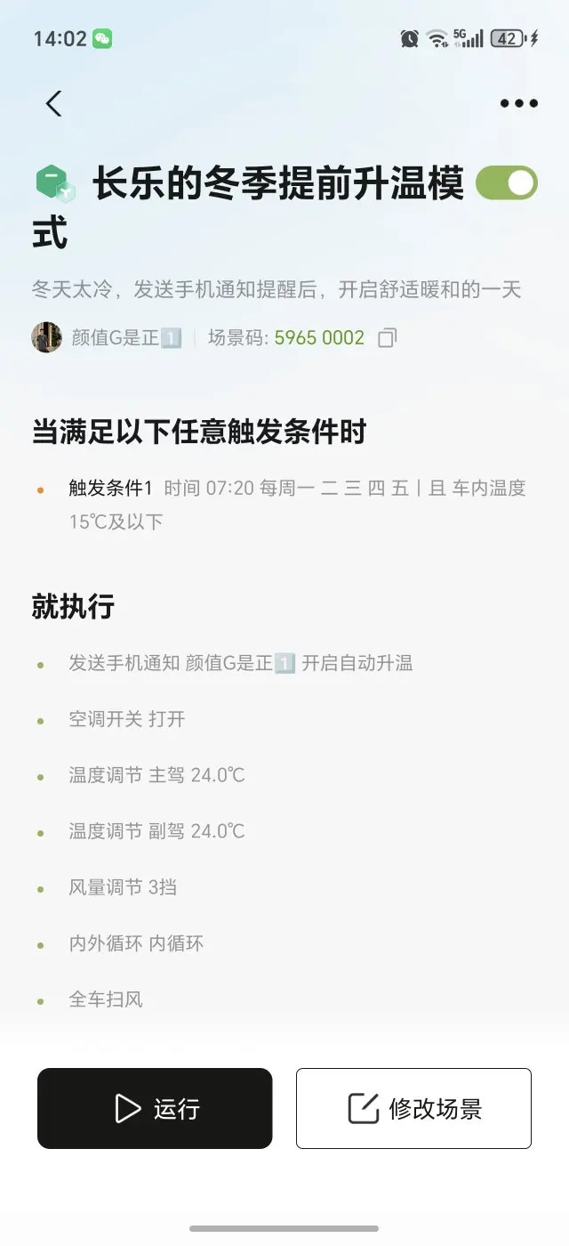 冬天很冷,不提前让车里暖和起来简直是个折磨!所以每次提前打开急速升温,基本十分钟就暖了起来,再加上智慧场景里的设置,这才是买小鹏的意义所在,太智能了!