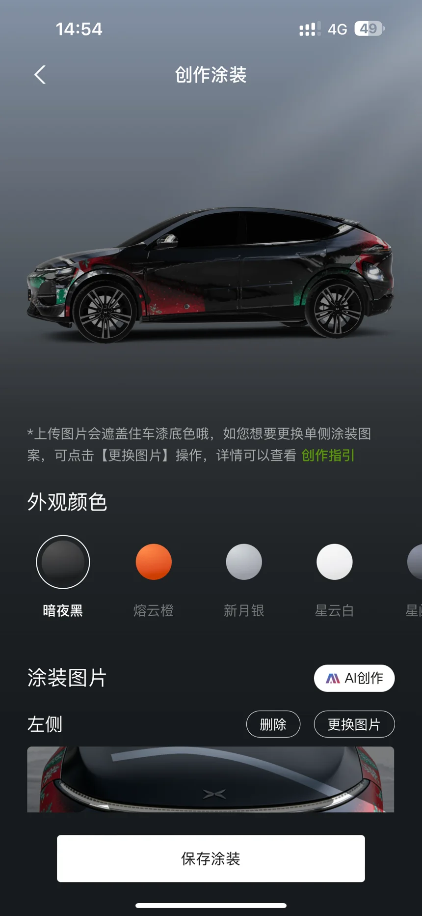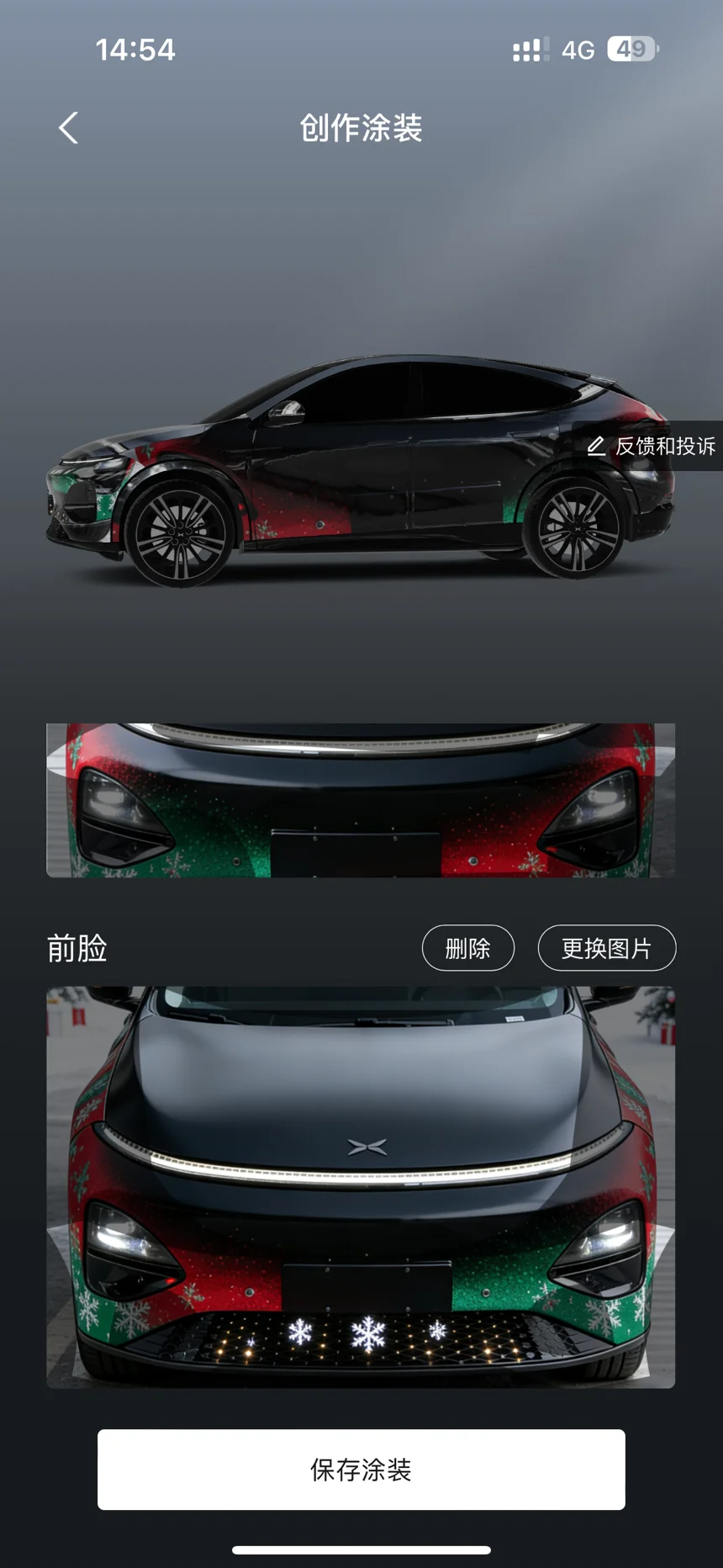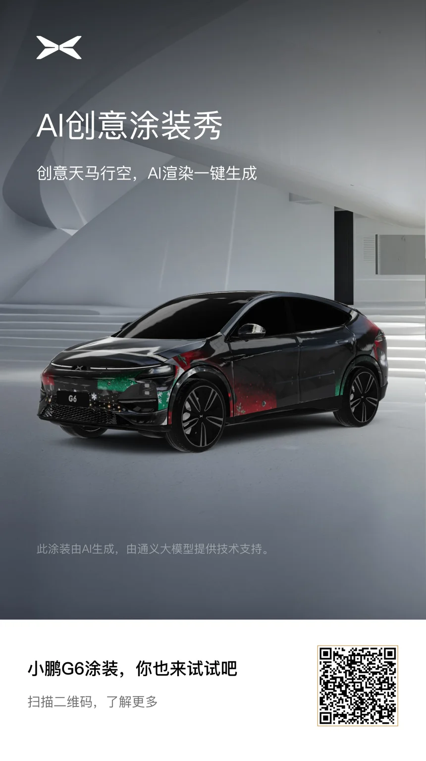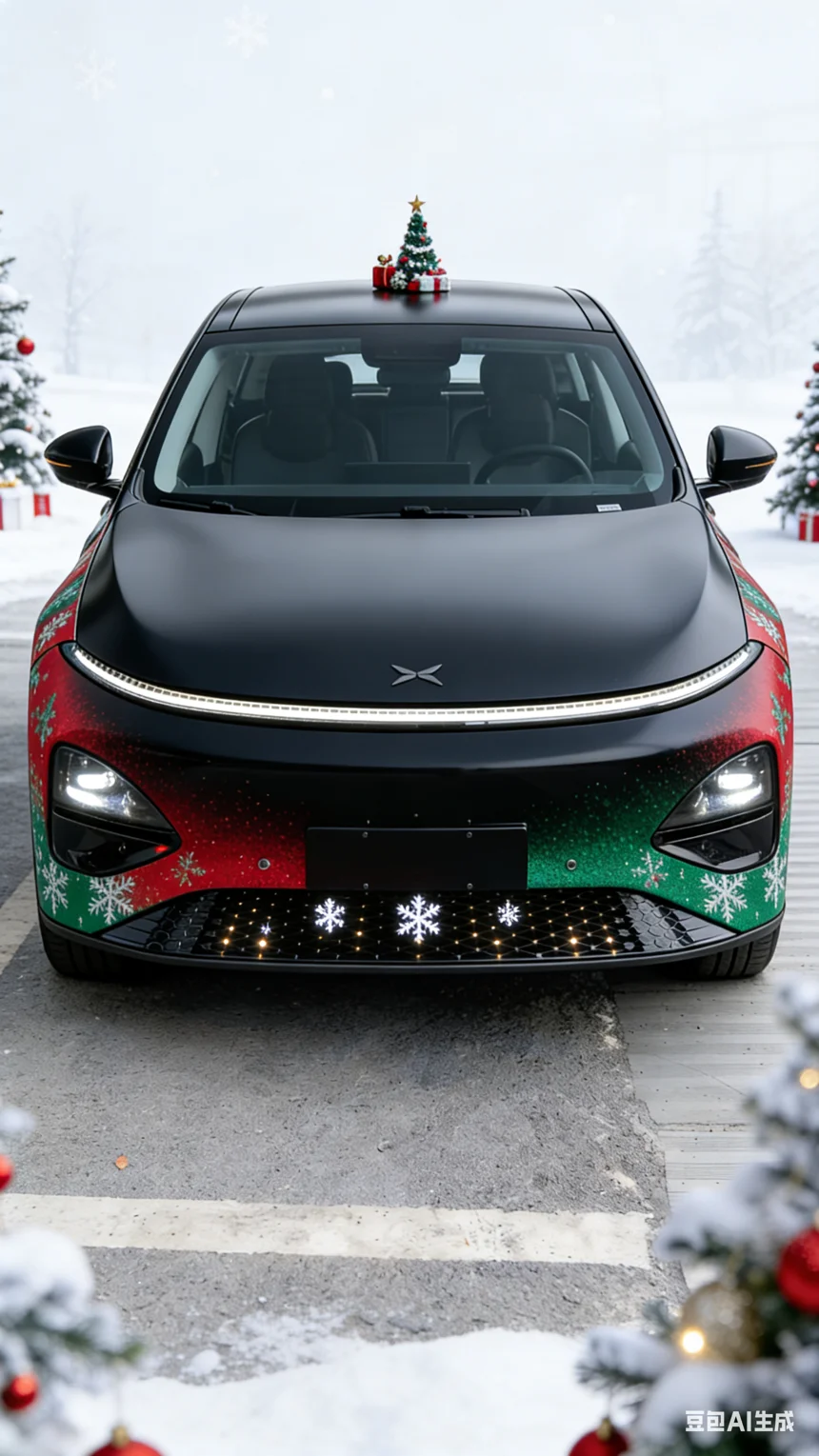 这款小鹏G6圣诞涂装以哑光黑为基底,车身侧腰晕染红绿色圣诞渐变花纹,前脸格栅点缀绿红圣诞色块,搭配科技感车身线条,圣诞氛围与未来感交融,AI渲染让涂装质感细腻又独特。