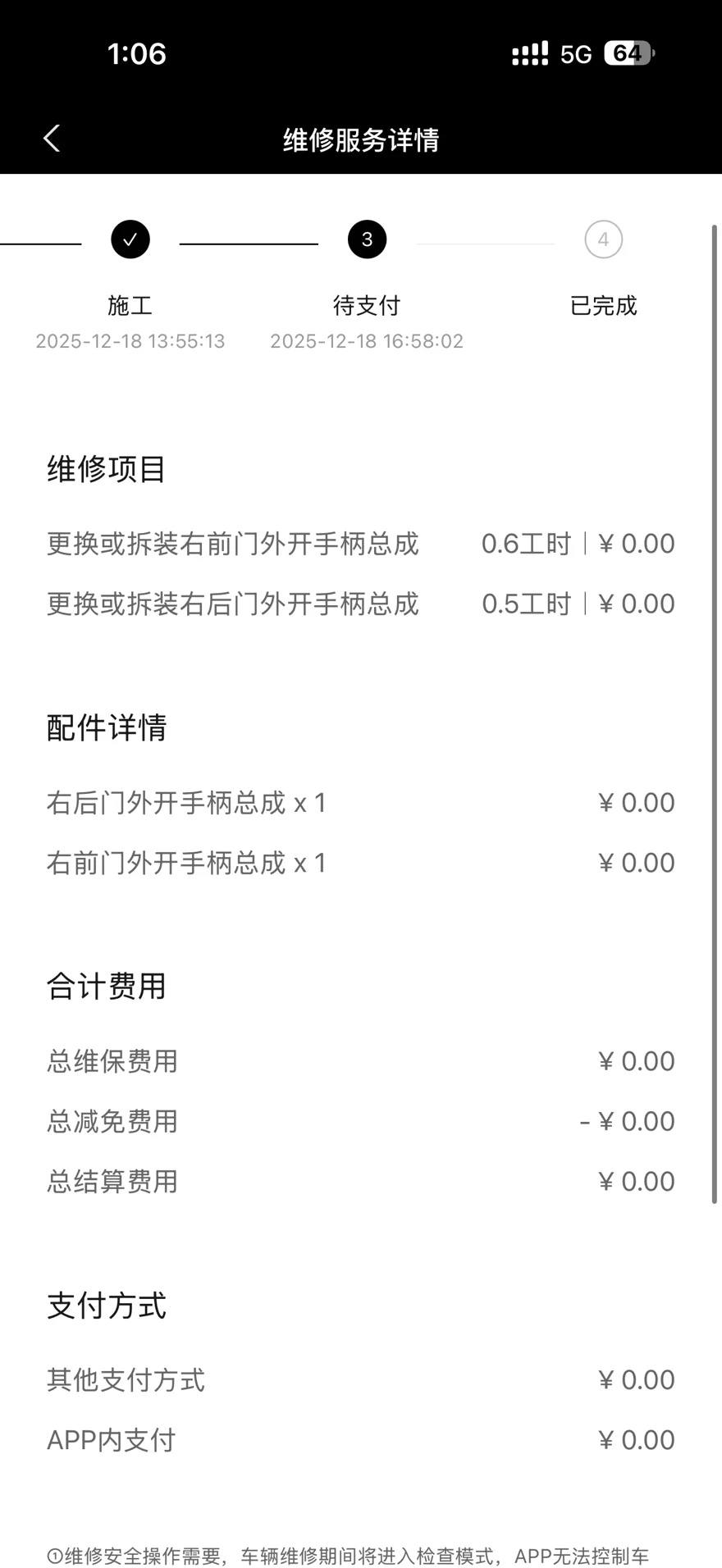 维修师傅技术娴熟,拆卸、更换原厂新配件、调试全程一丝不苟,反复测试确保门把手弹出收回顺畅无异响,仅用一小时就完成了更换。全程无隐形消费,费用透明,维修进度还实时同步。