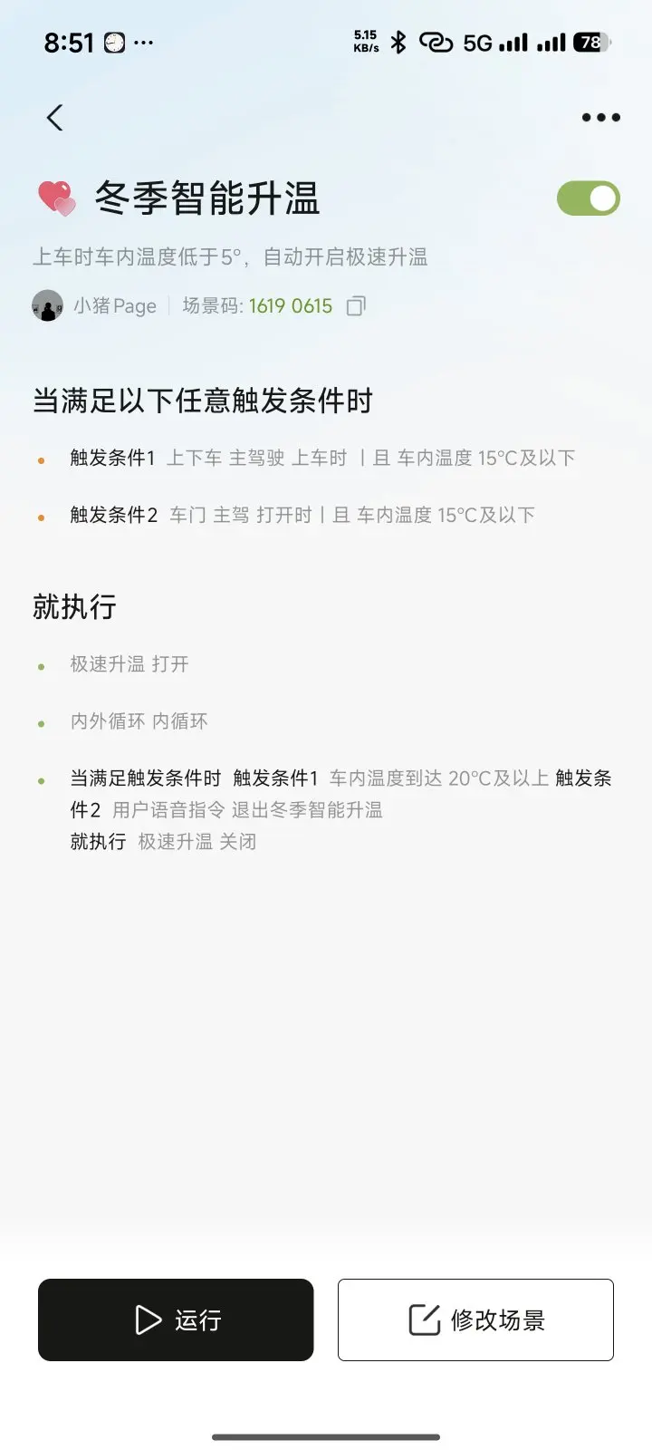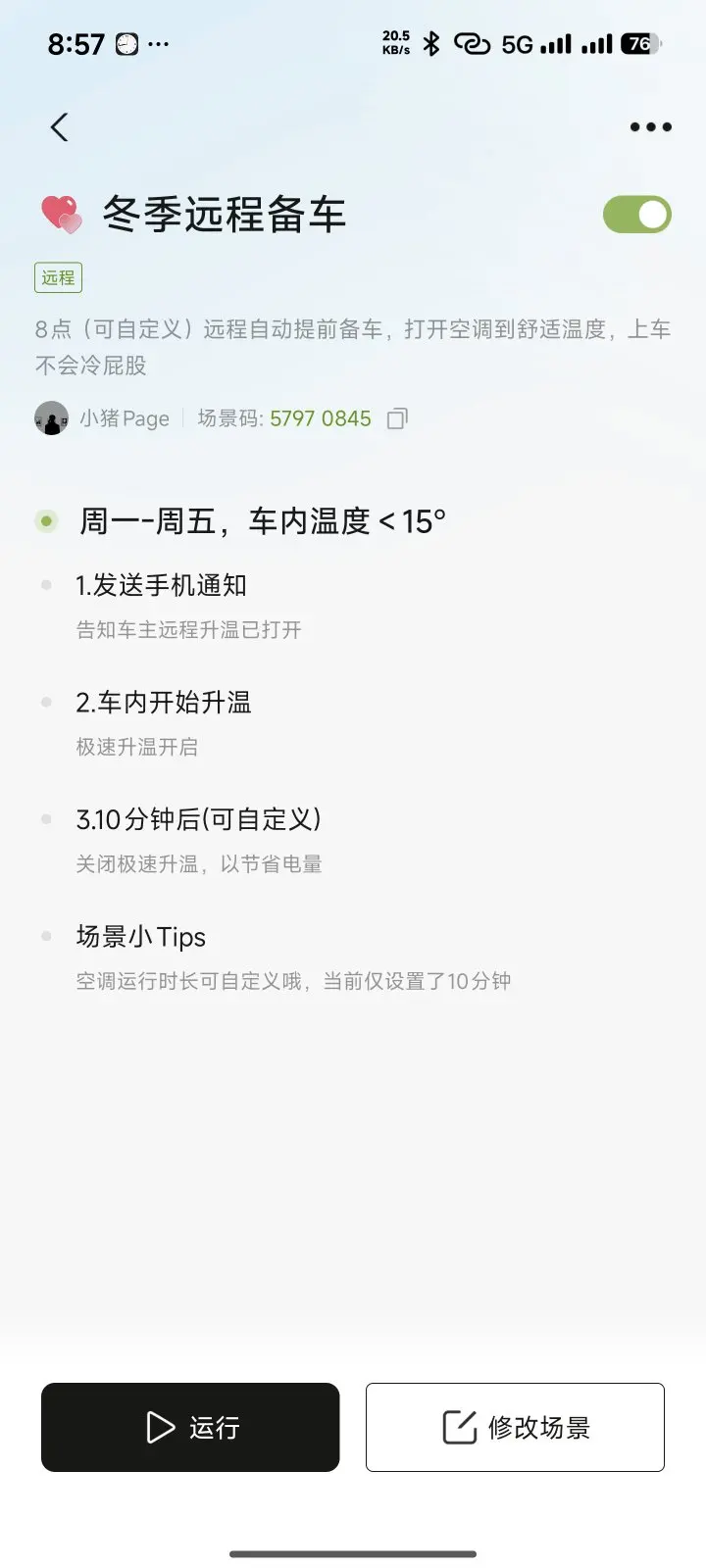 冬天有了这三个智慧场景就不怕坐在车里面冷了,上一辆油车,冬天真是冻死个人了,车都开半天了,方向盘还是凉的,电车有方向盘加热是真的好呀,还能远程开启,太方便了。