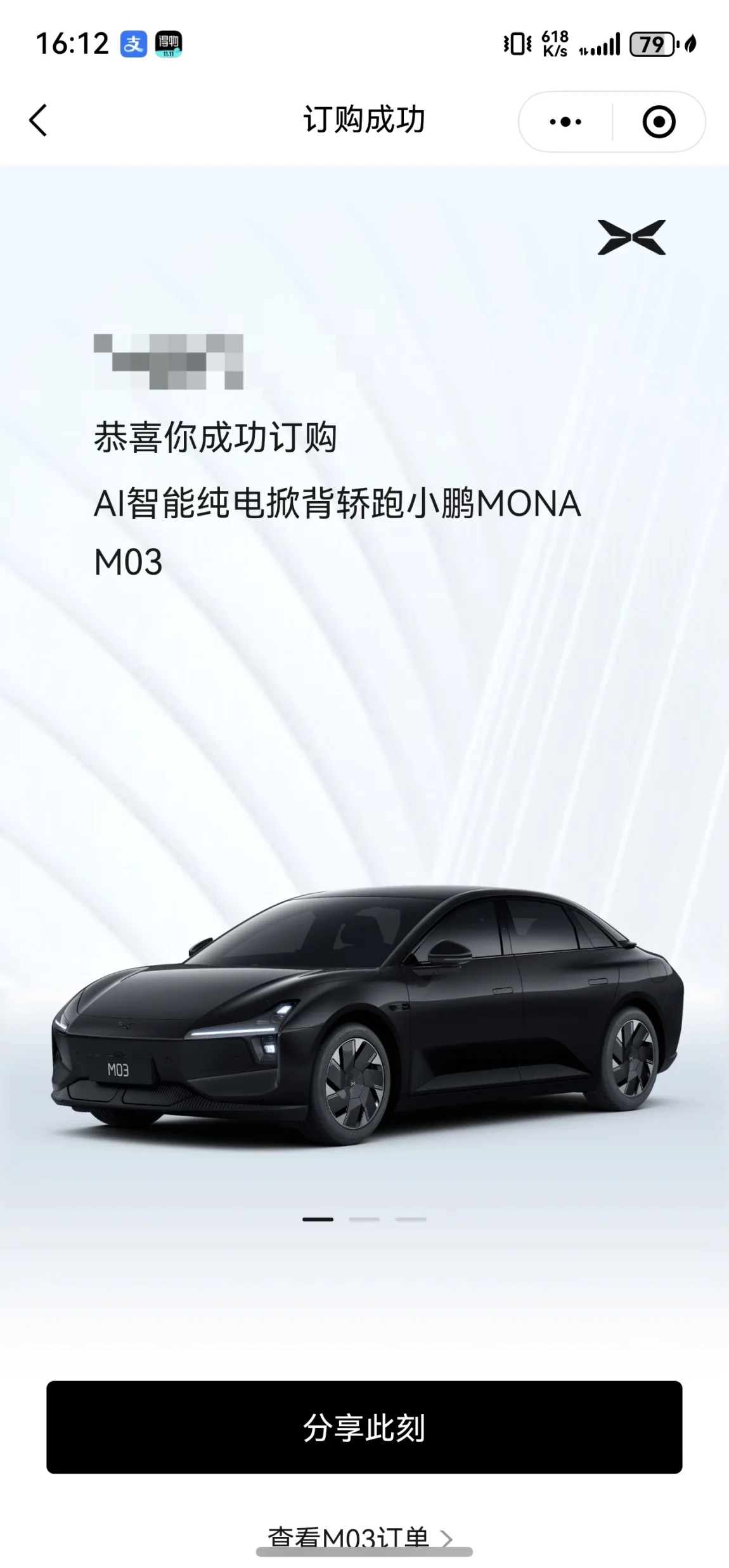 交完订金4天,车就到了,太快了。可惜没有时间,只好硬生生等到周末去提车,太煎熬了😂黑车实车有点酷哦,虽然订车之前有点诟病它的后尾灯,可是拿到实车以后,好像也还可以接受,越看呢越觉得喜欢。现在想想,那天下午从踏进小鹏店铺到,最终订车提车,真是冥冥之中注定与mona m03有缘。提车至今开的很舒服,以前的油车闲置在那边好久了,也算是体会到了开电车的快乐,加油站三过而不入,还是电费更加省钱哦😁😁😁#我的提车作业#