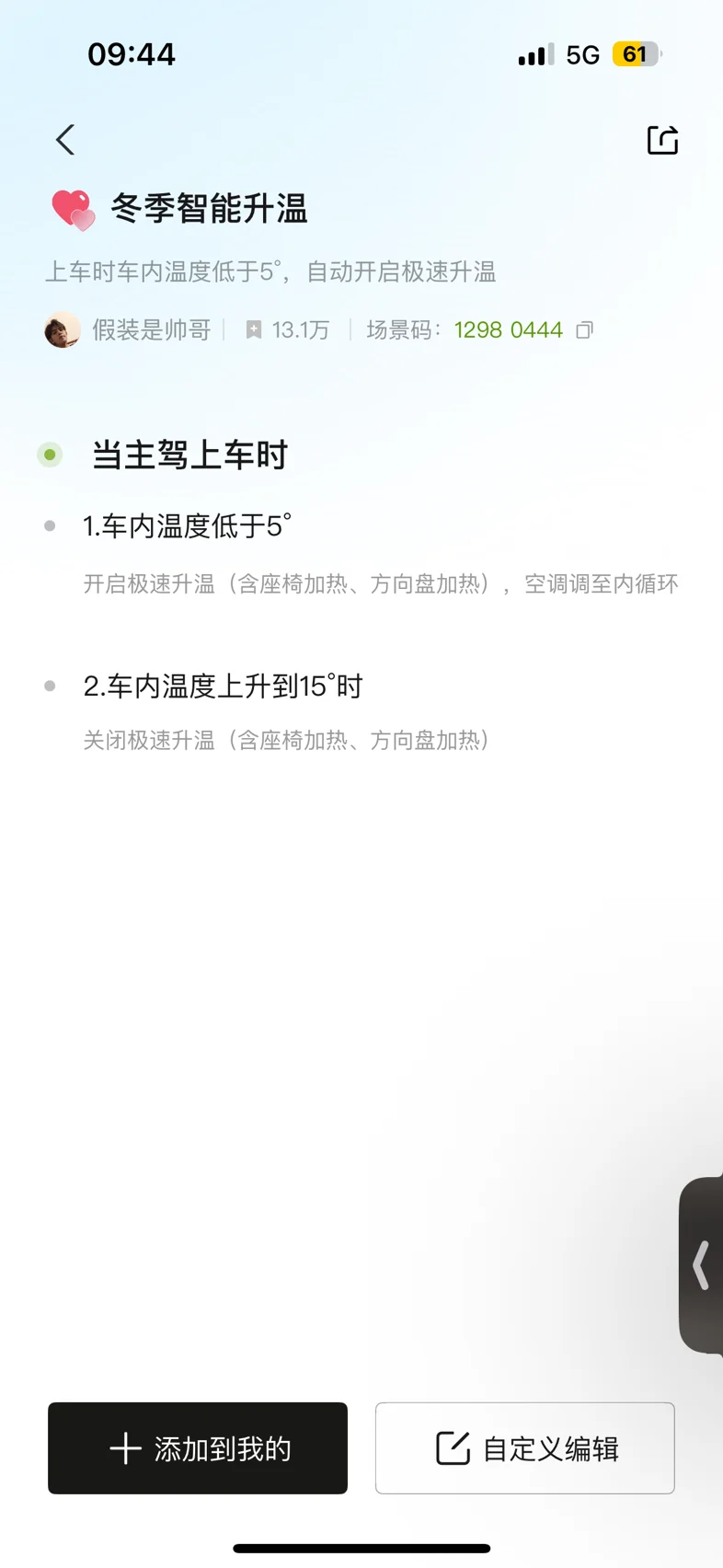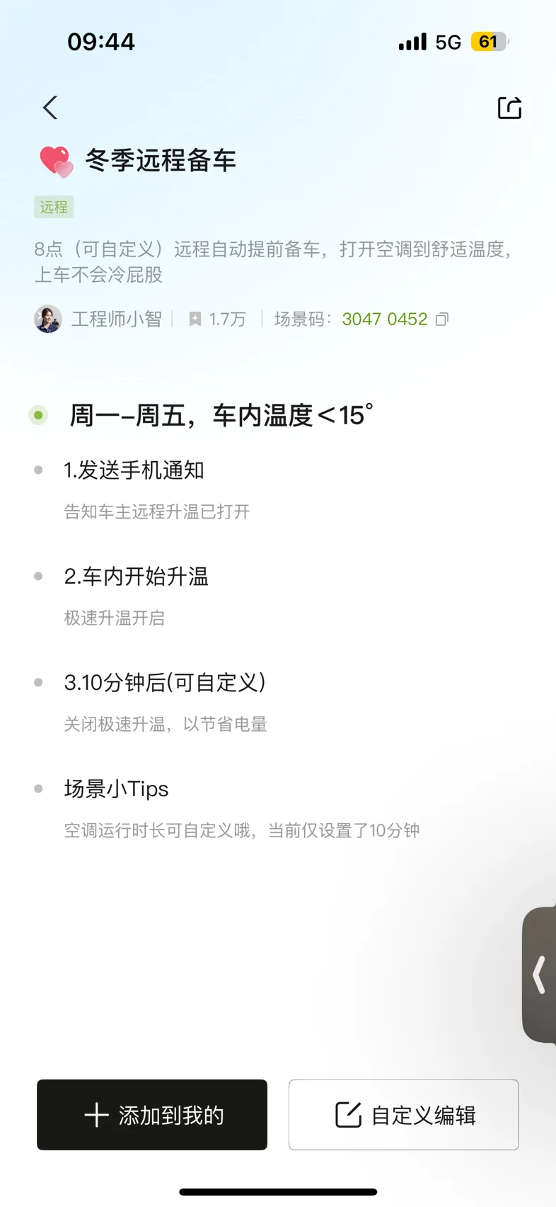 怕的家人们,可以通过手机小鹏app软件打开空调调节,点击方向盘加热,座椅加热,提前打开空调,空调开启后15分钟后自行关闭,还可以在智慧场景中添加冬季智能升温。